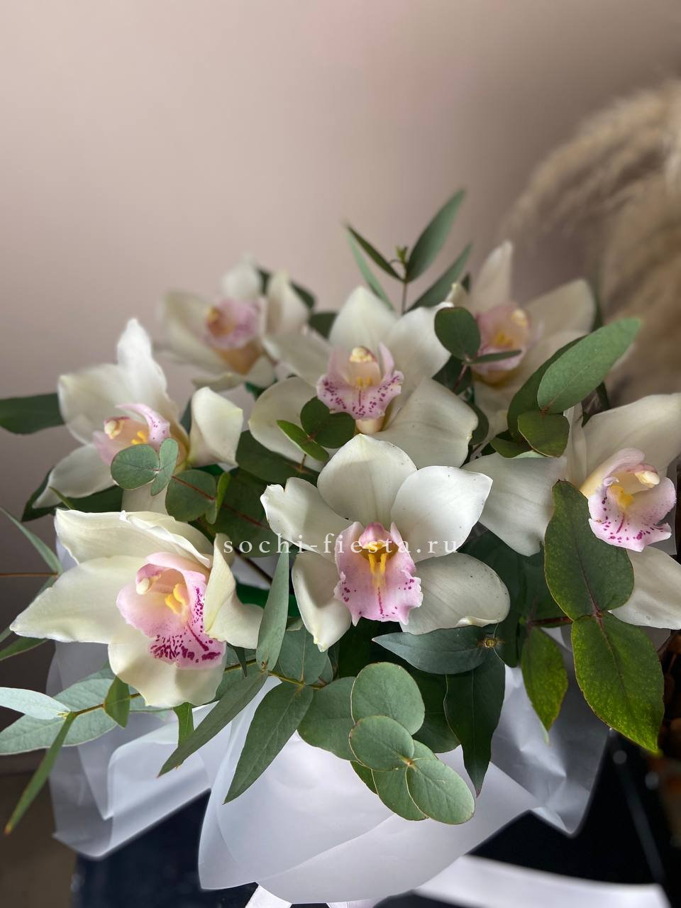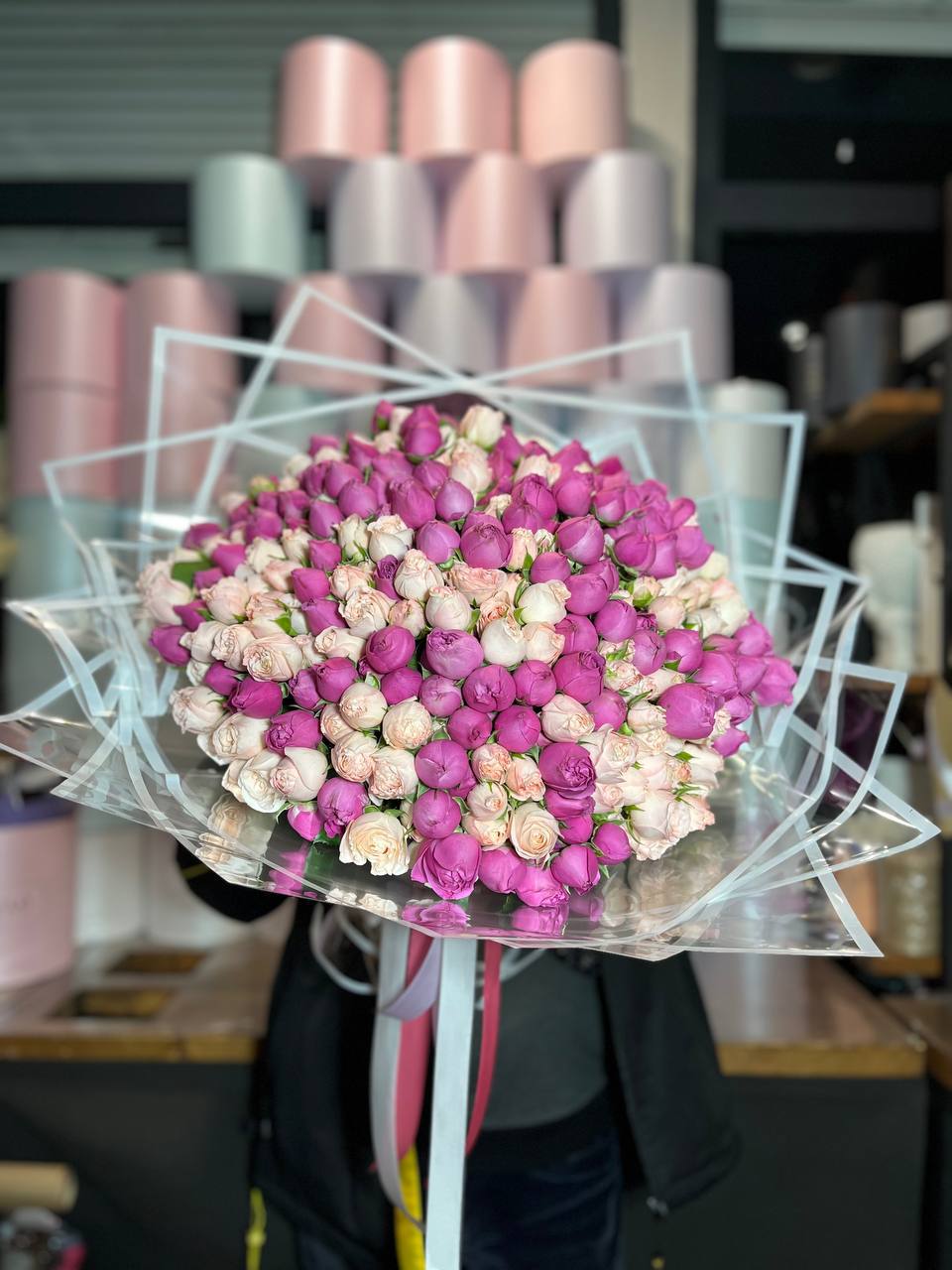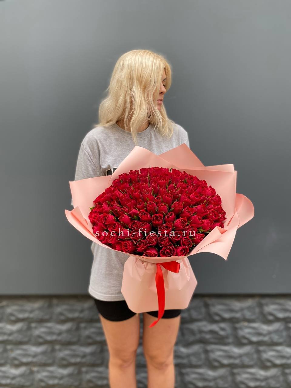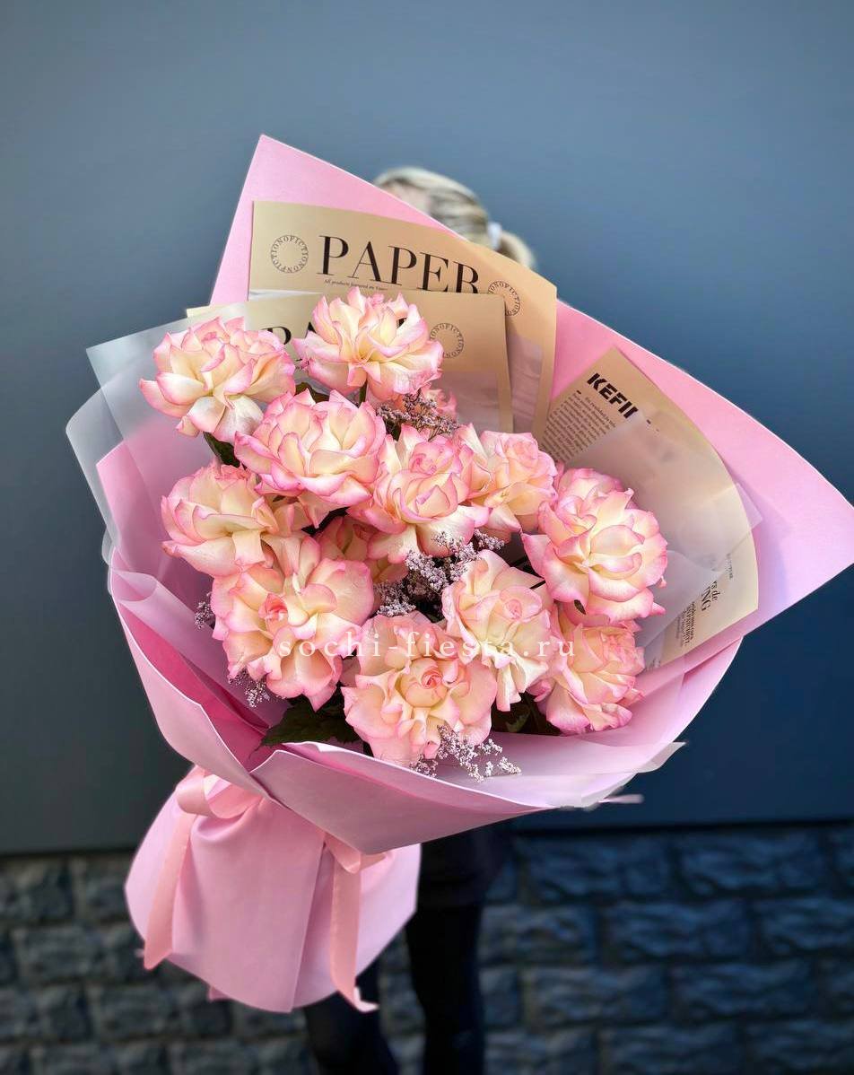 Французские розы Джумилия раскрываются широкими бутонами и формируют яркую композицию из пятнадцати стеблей. Каждый цветок демонстрирует характерную для сорта фактуру с плотными слоями лепестков.