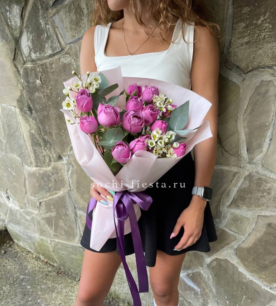 Пятнадцать вывернутых роз Джумилия раскрывают свою многослойную структуру в каждом бутоне. Эвкалипт обрамляет композицию, подчёркивая фактуру лепестков.