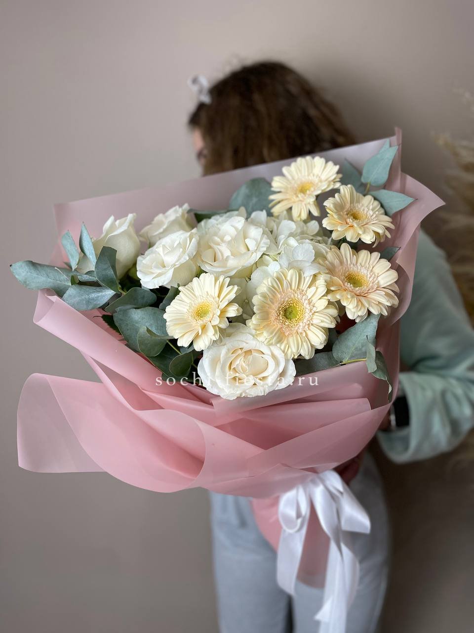 Пятьсот один бутон выстроены плотными рядами в глубокой корзине. Белоснежная композиция создаёт эффект цветочного облака, способного заполнить собой всё пространство вокруг.