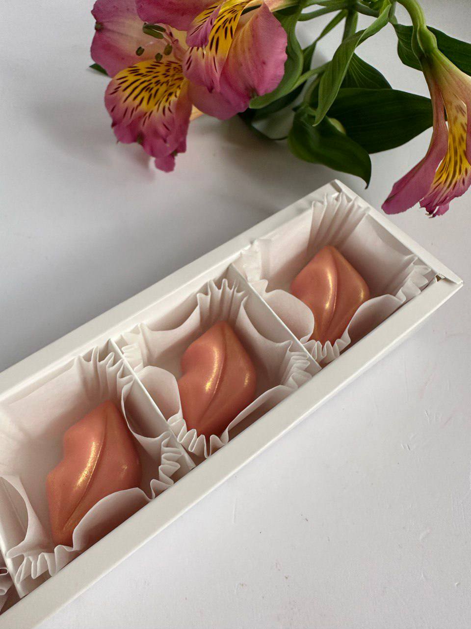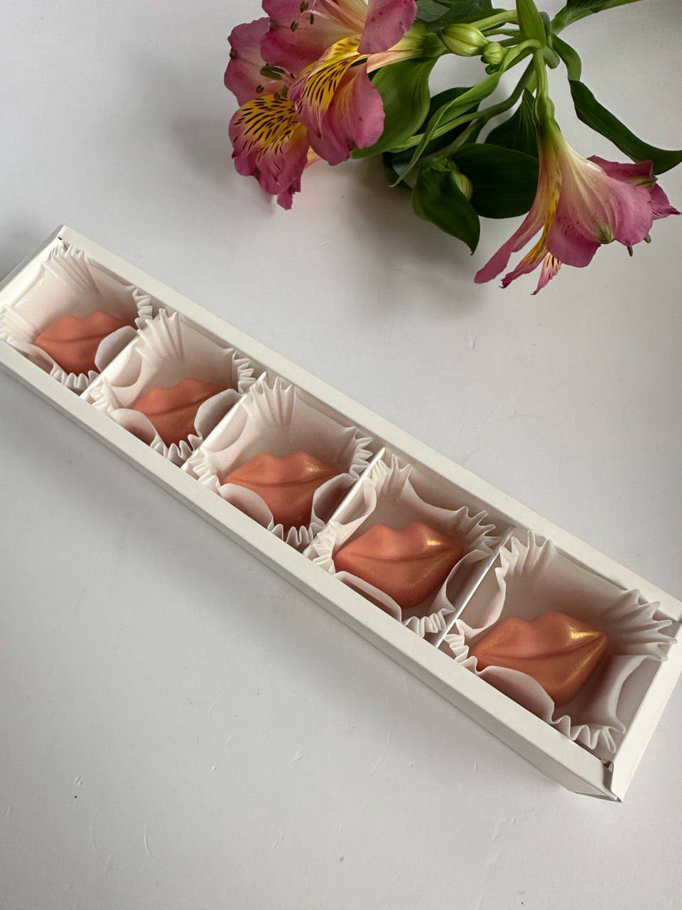 Пять шоколадных губ с неповторимым узором ручной росписи. Каждая деталь выполнена из бельгийского шоколада и подчинена общей идее игривого настроения. Яркий акцент для тех, кто любит эмоции.