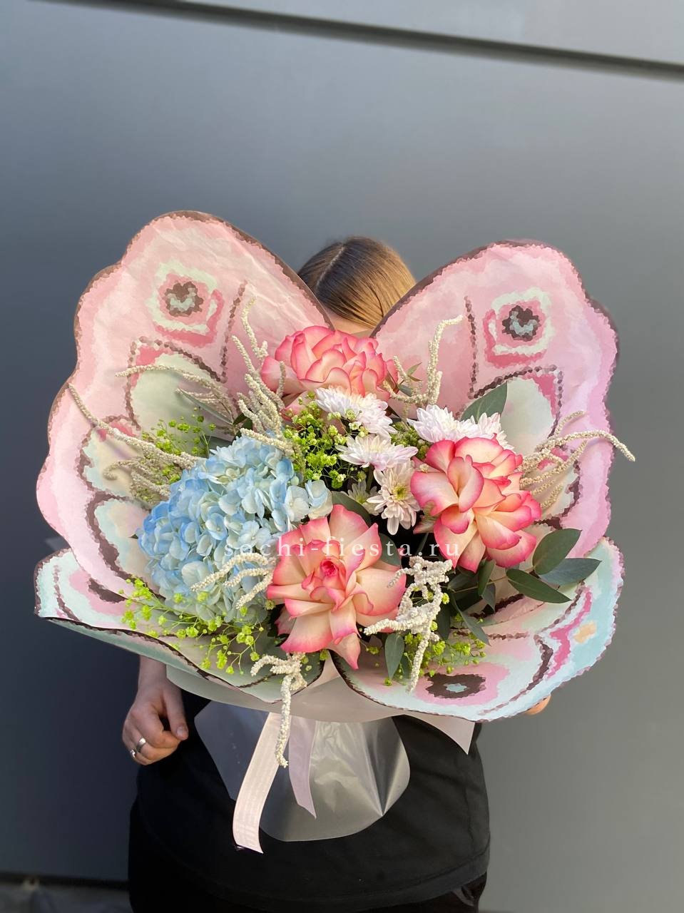 Тридцать девять шаров собраны в воздушную массу, которая заполняет пространство и меняет его масштаб. Композиция держится на грузике и создаёт ощущение лёгкого парения над поверхностью.