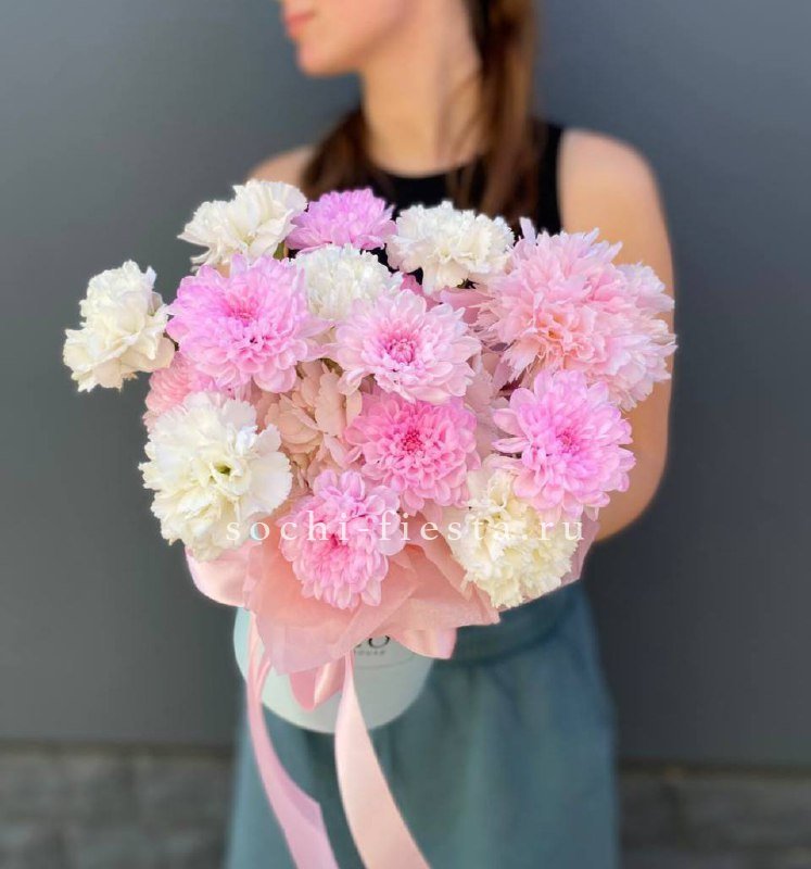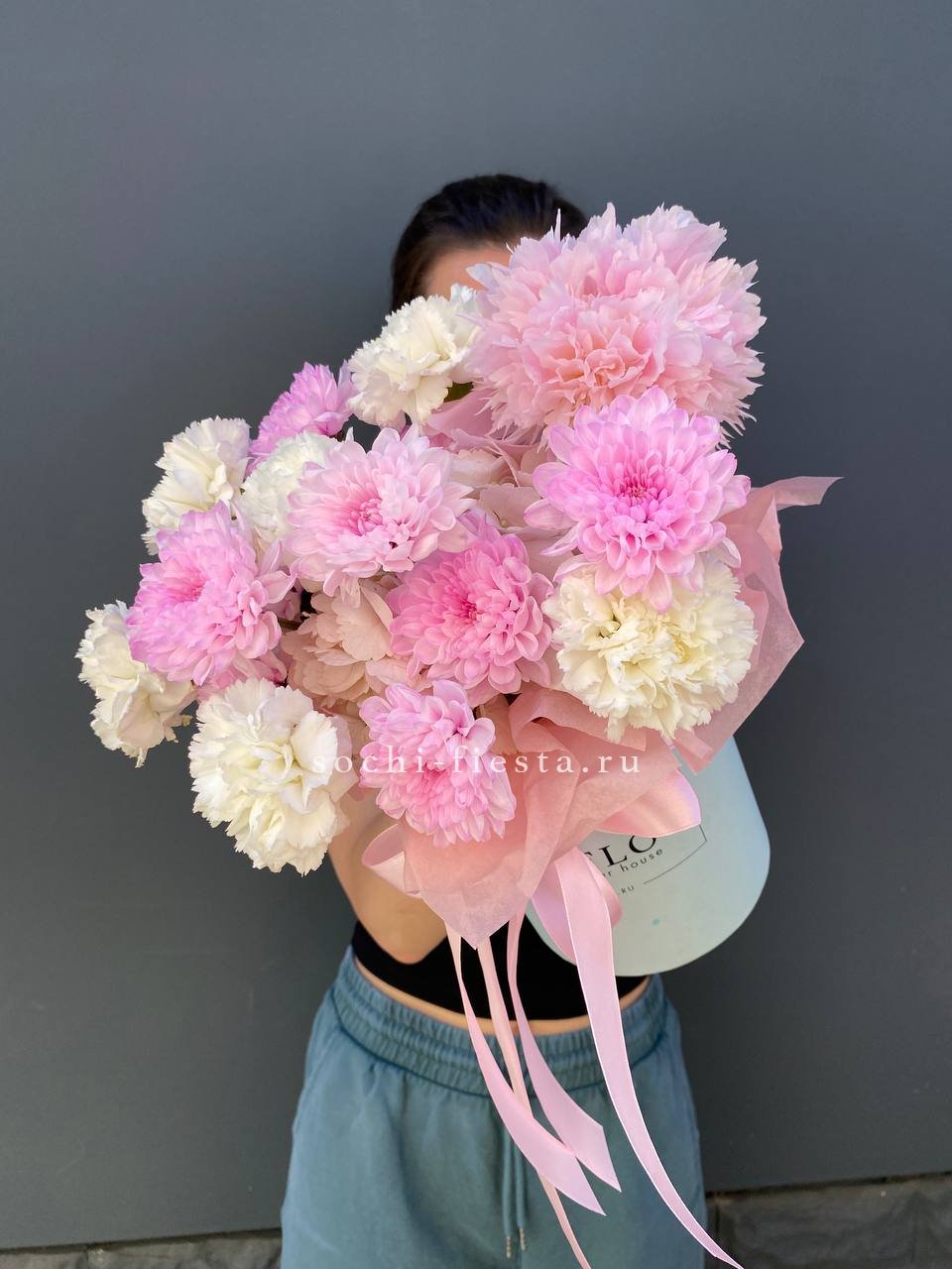 гортензия, эустома, диантусы, розы, эвкалипт и прочие цветы, гармонирующие по фактуре. Цветочная композиция в белых, нежно-сиреневых, розовых тонах в квадратном боксе D25.