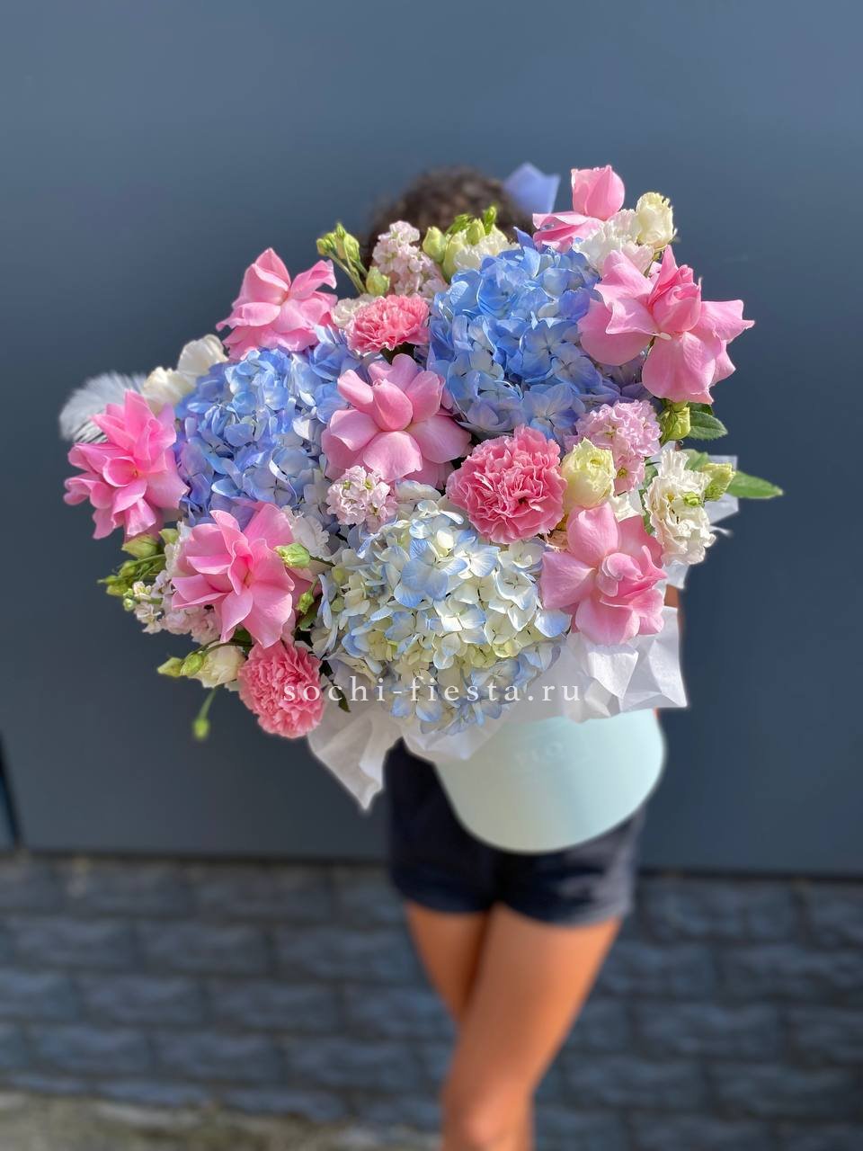 Розовые оттенки переходят друг в друга через маттиолу и диантусы. Перо добавляет графичности, а гортензии создают воздушную текстуру в основании композиции.