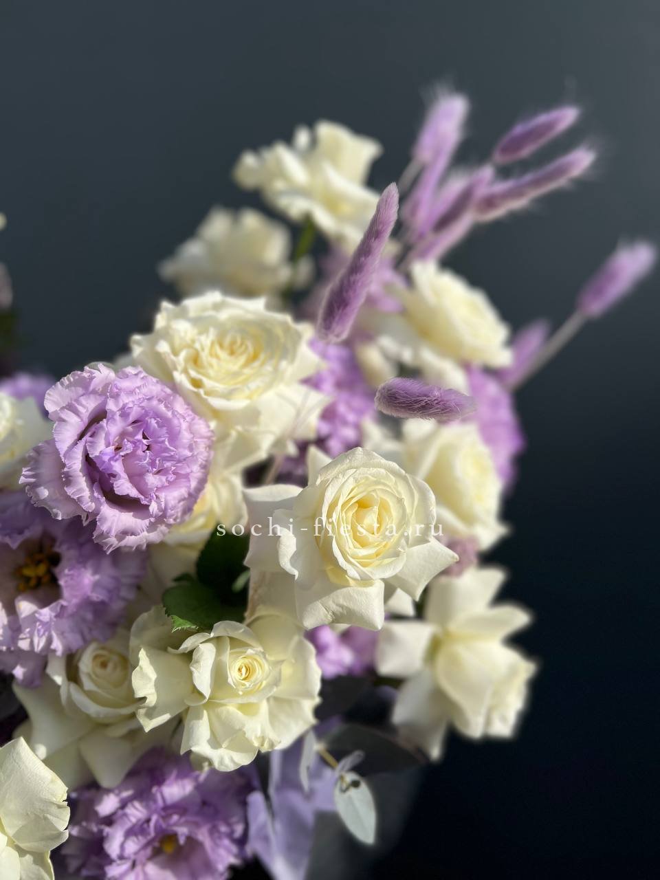 Пионовидные розы раскрывают многослойные бутоны рядом с пышной гортензией и многоцветковой эустомой. Эвкалипт обрамляет композицию мягкими ветвями.