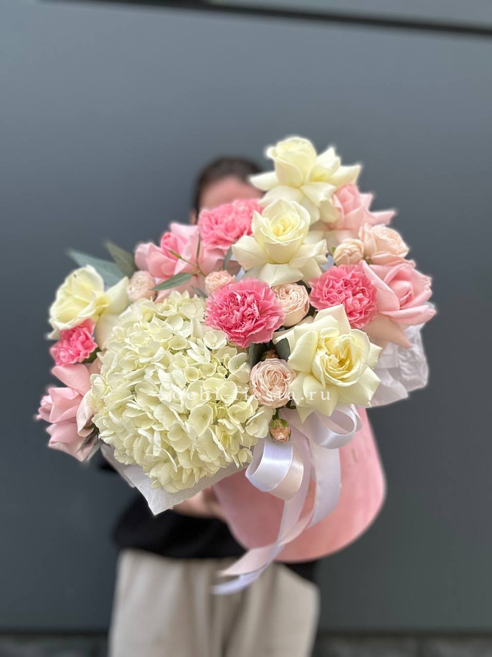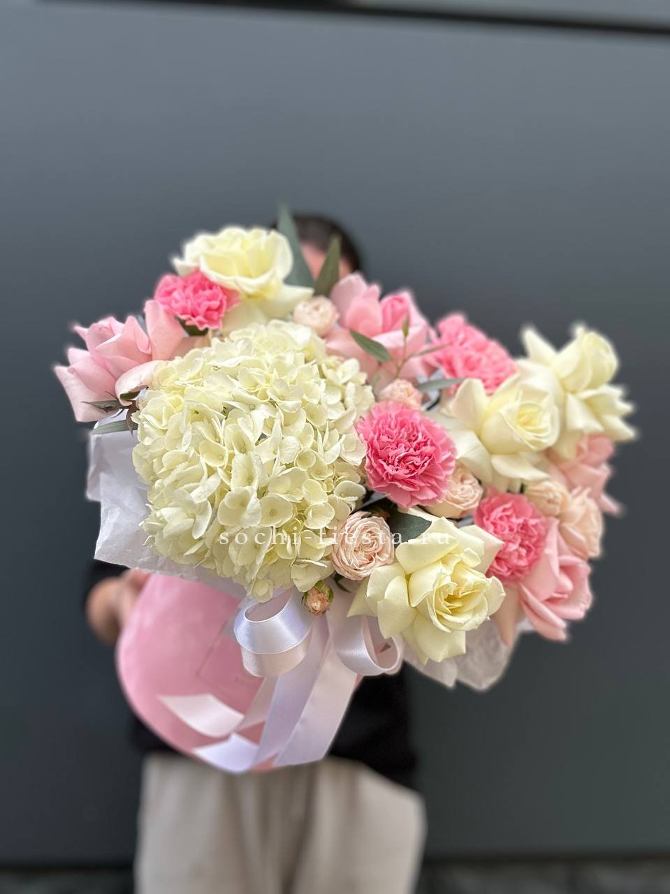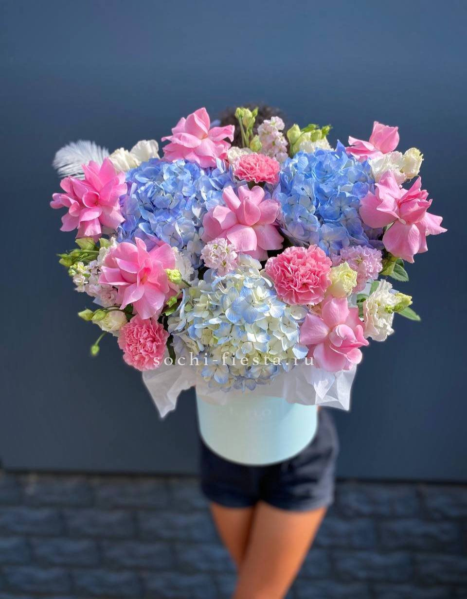 гортензия, пионовидные розы, эустома, эвкалипт, бокс 16.