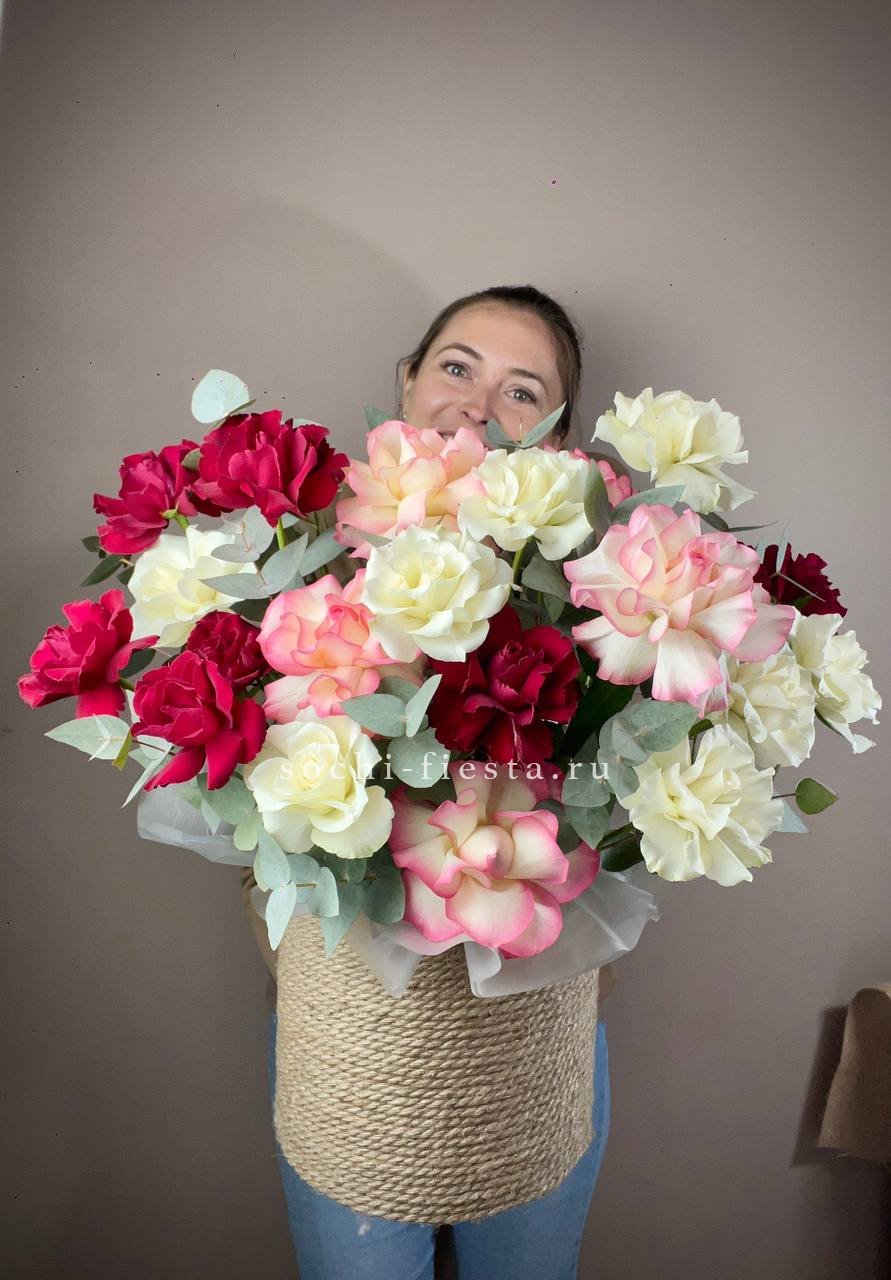 35 французских роз микс в джутовом боксе