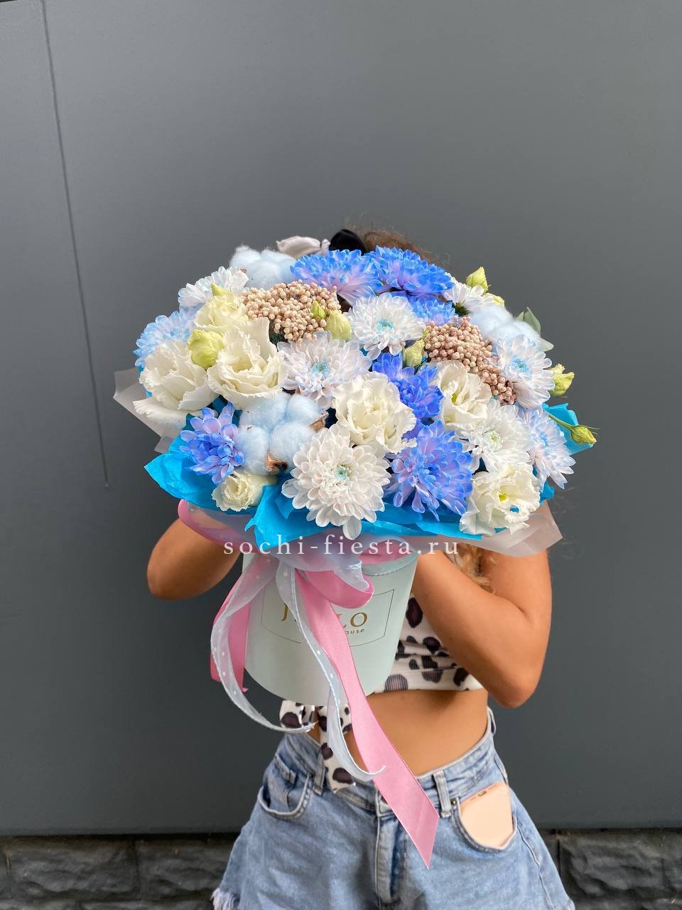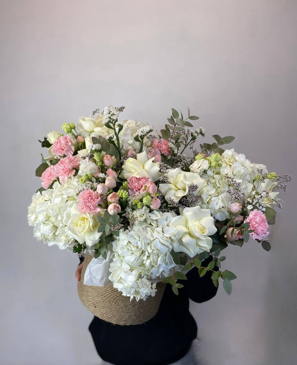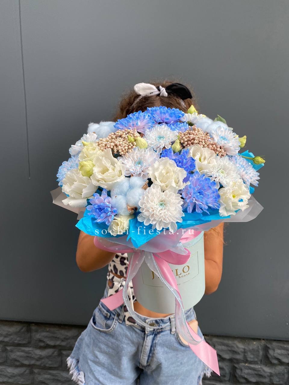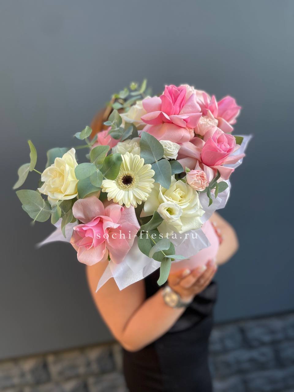 гербера, розовая роза, бомбастик, белая роза, эустома, бокс 13.