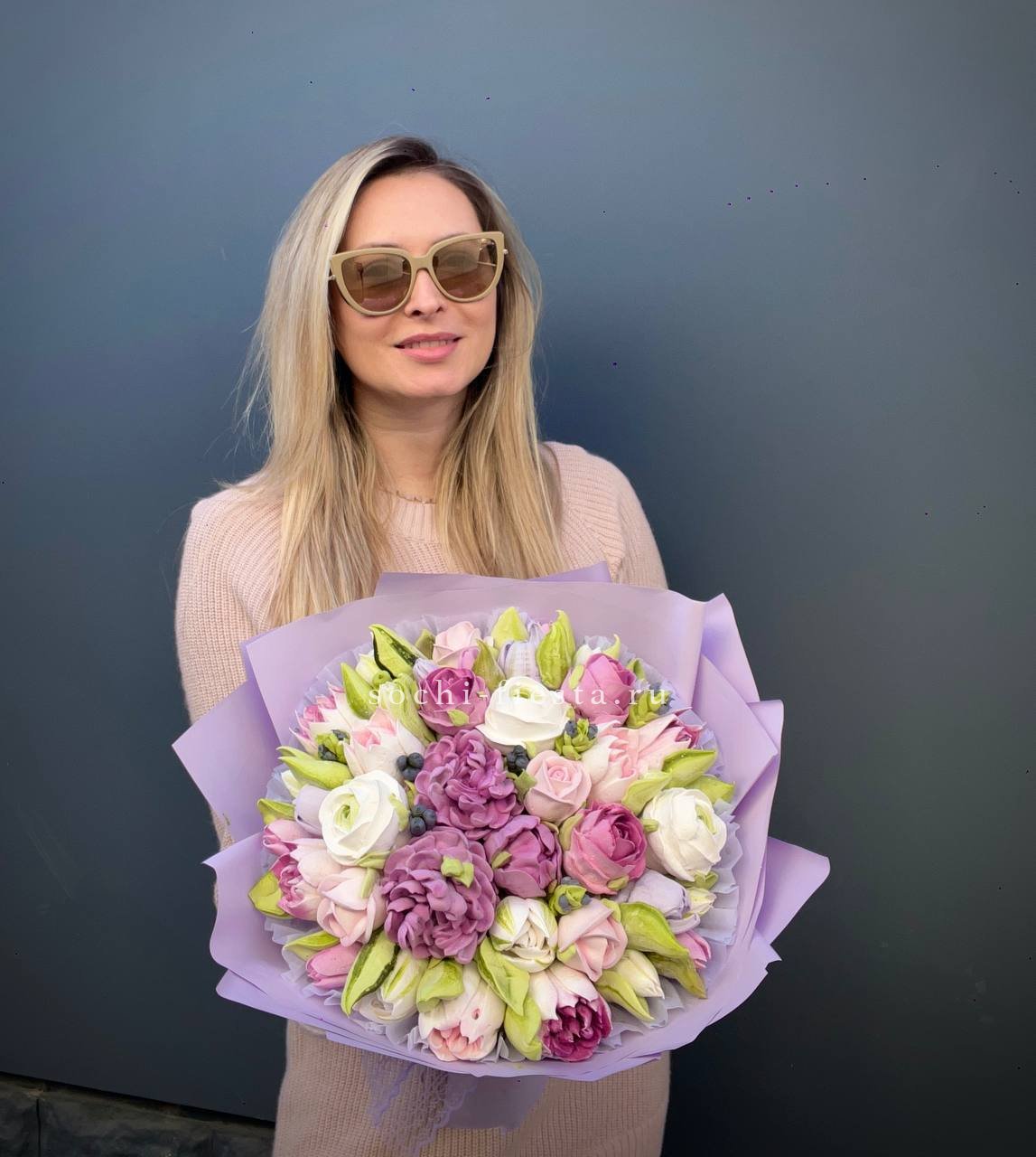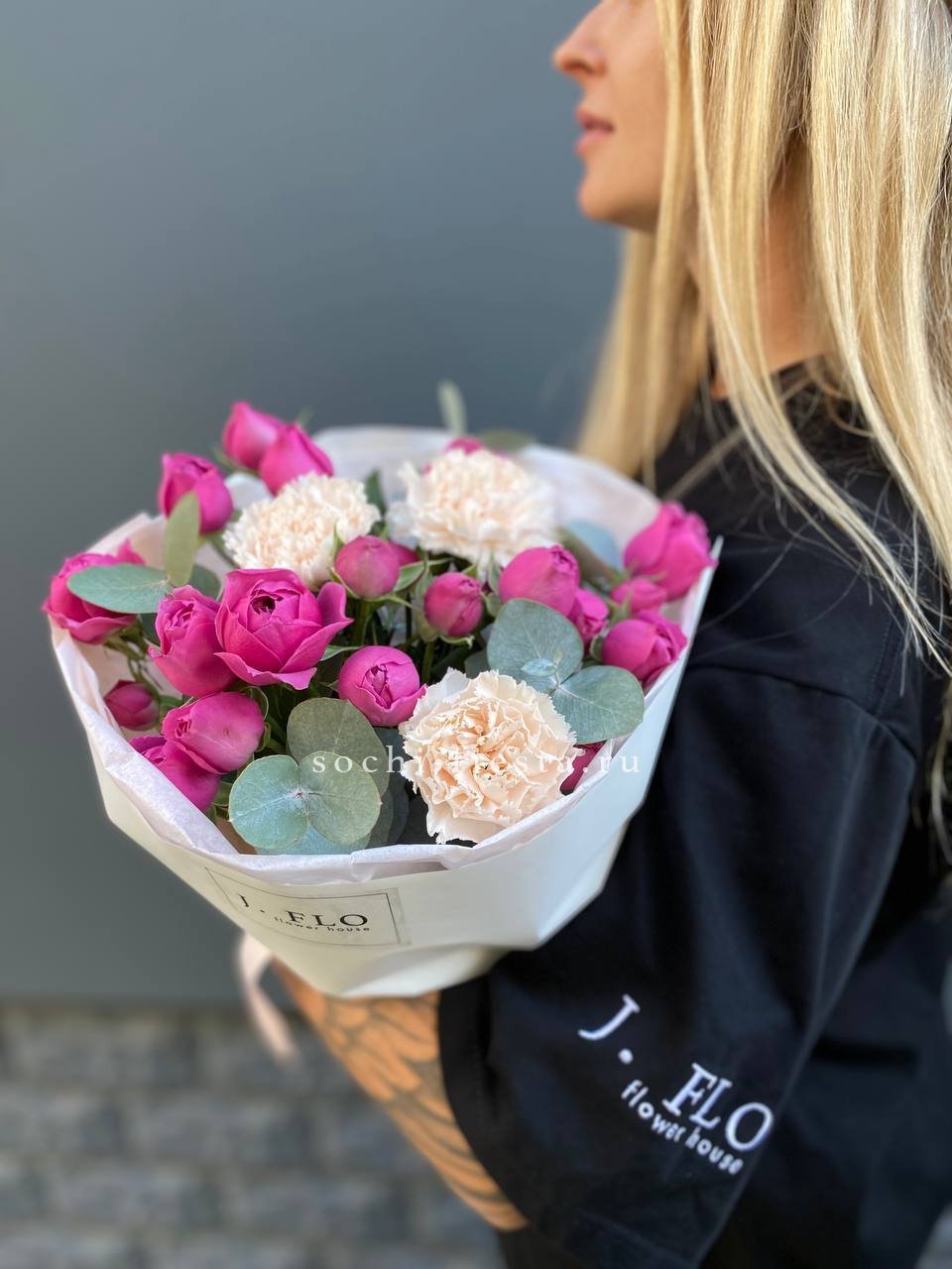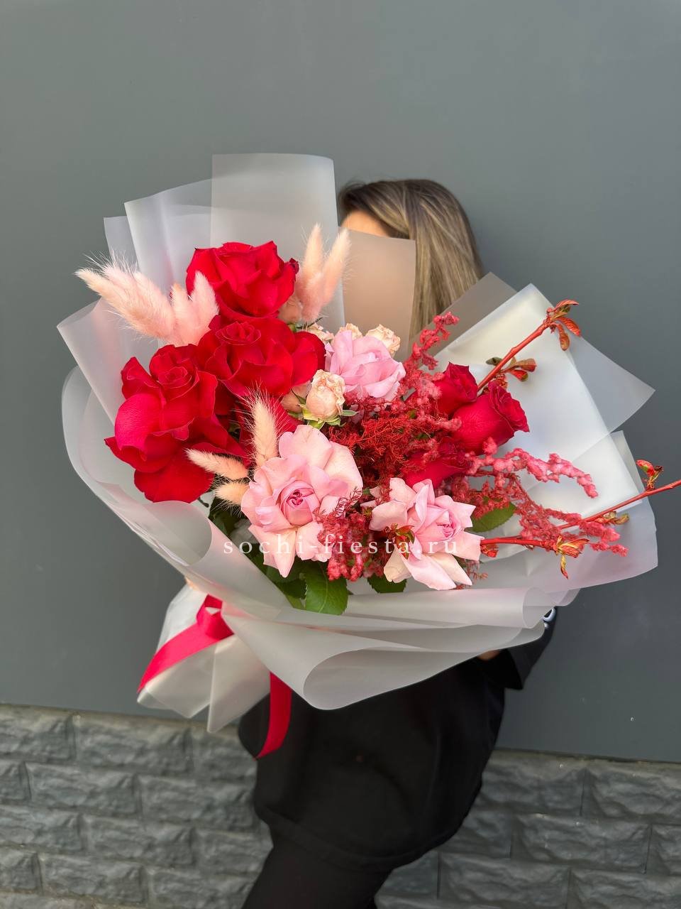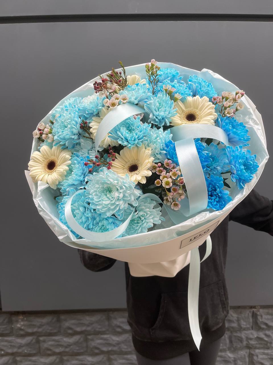 гербера, розовая роза, бомбастик, белая роза, эустома, бокс 13.