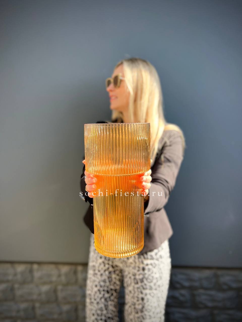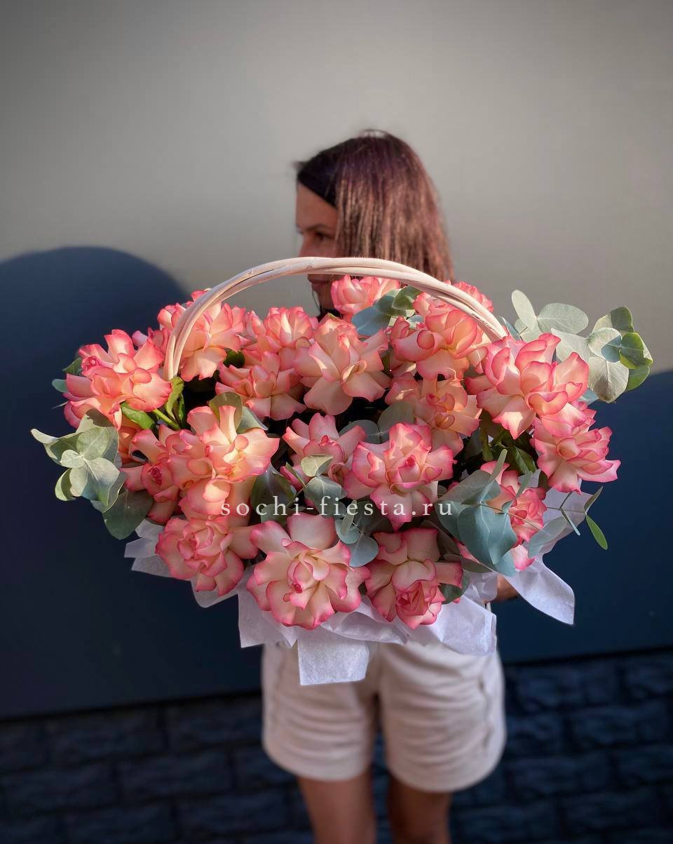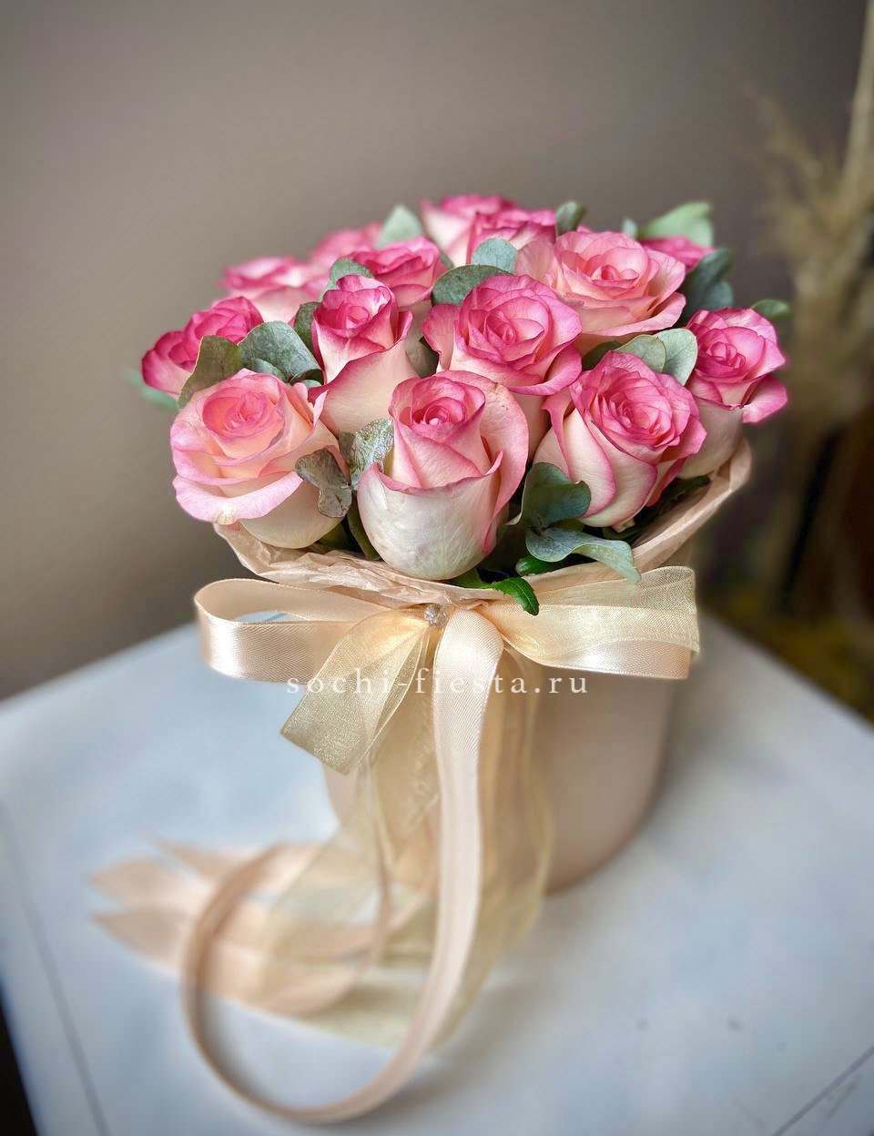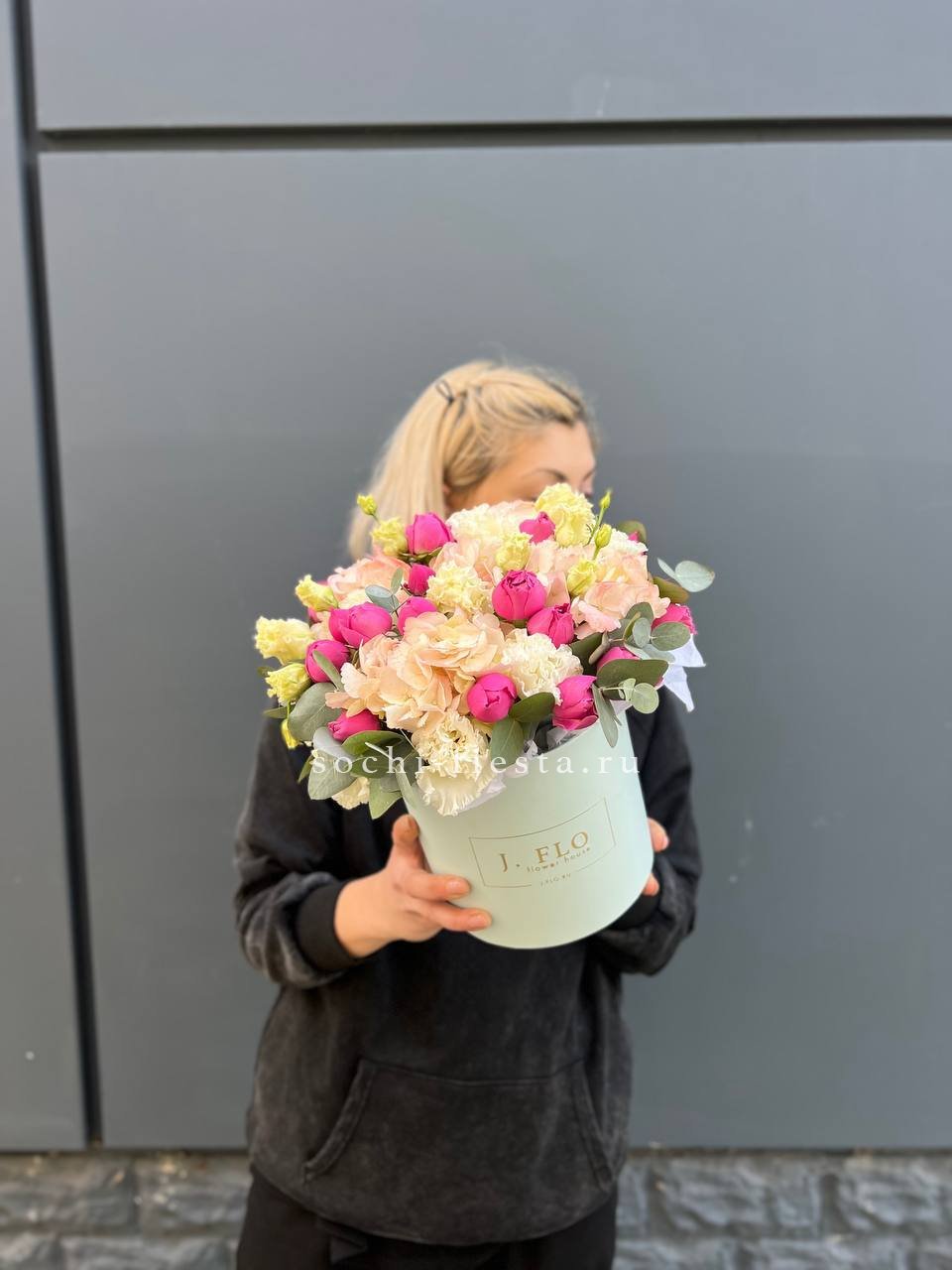 Герберы и розы двух оттенков выстроены плотными рядами в компактном боксе. Бомбастик придает текстуру, а эустома смягчает линии композиции.