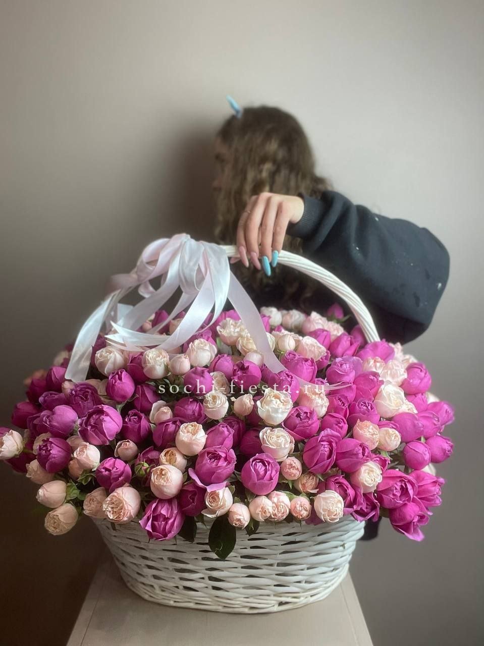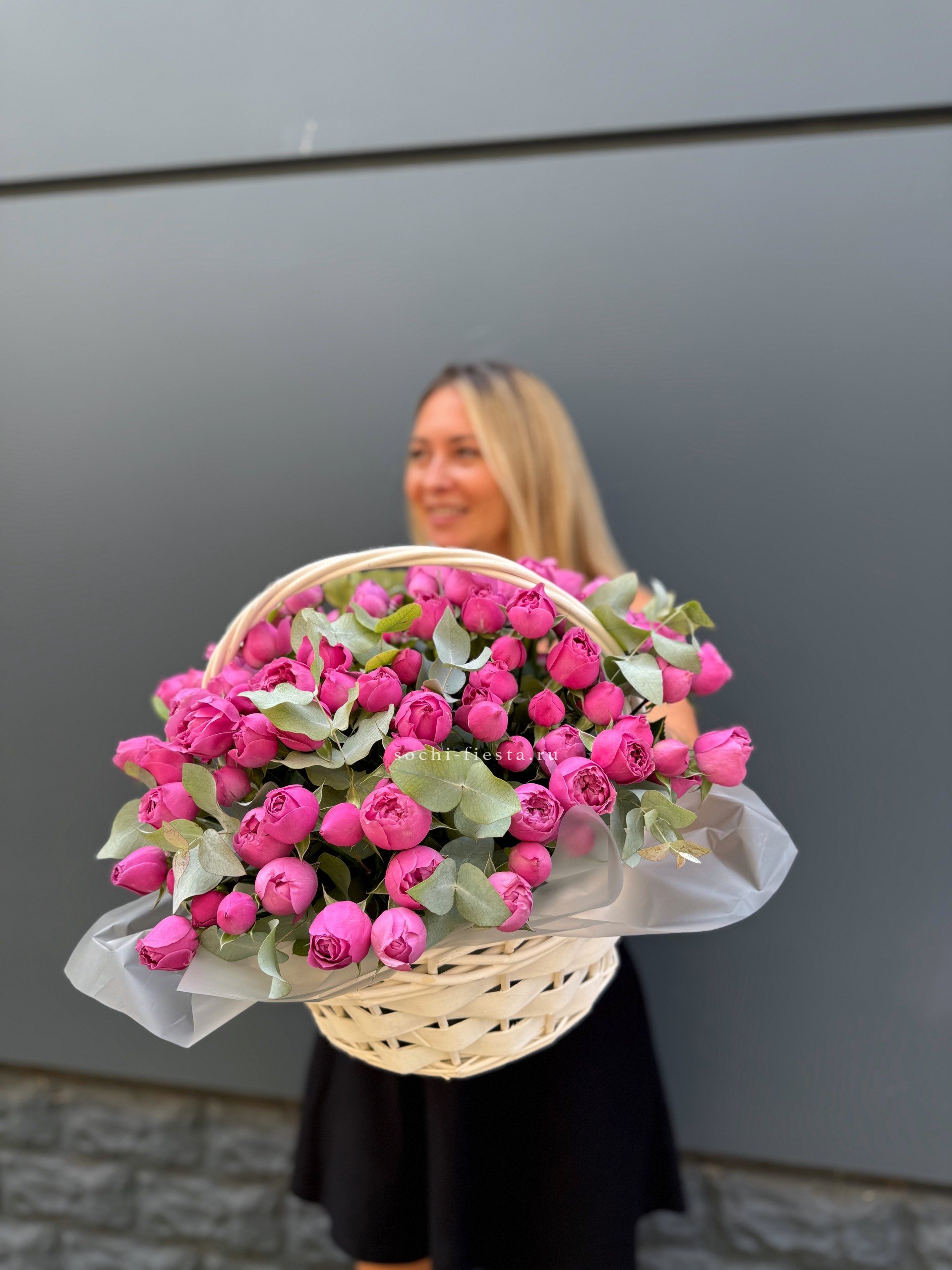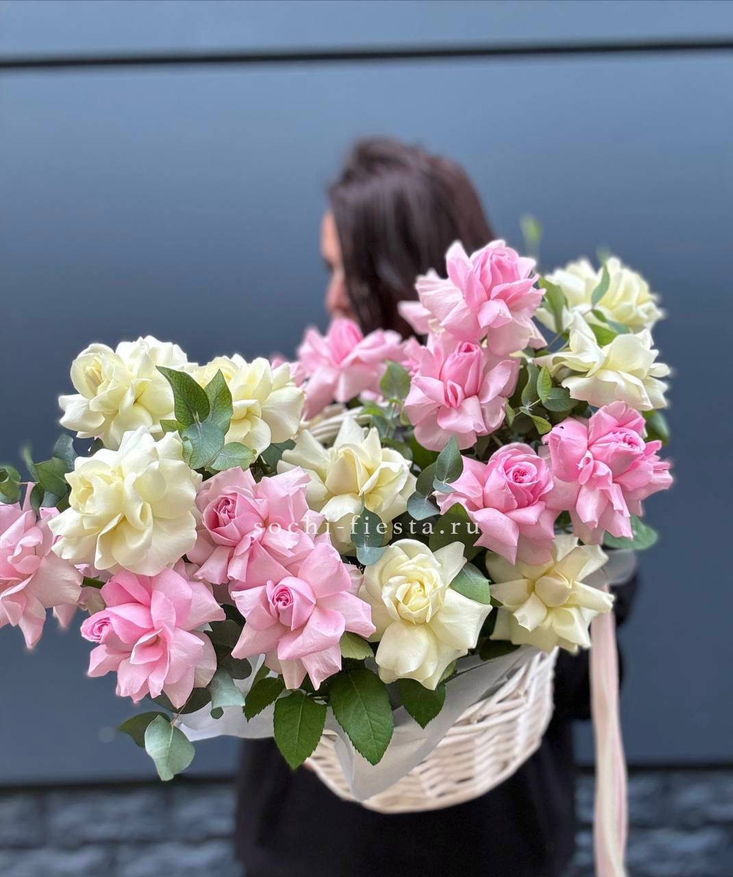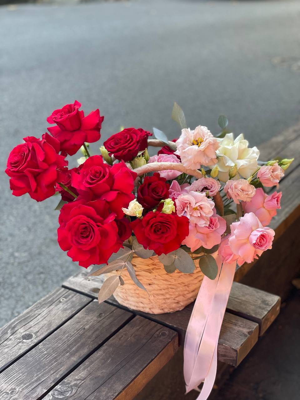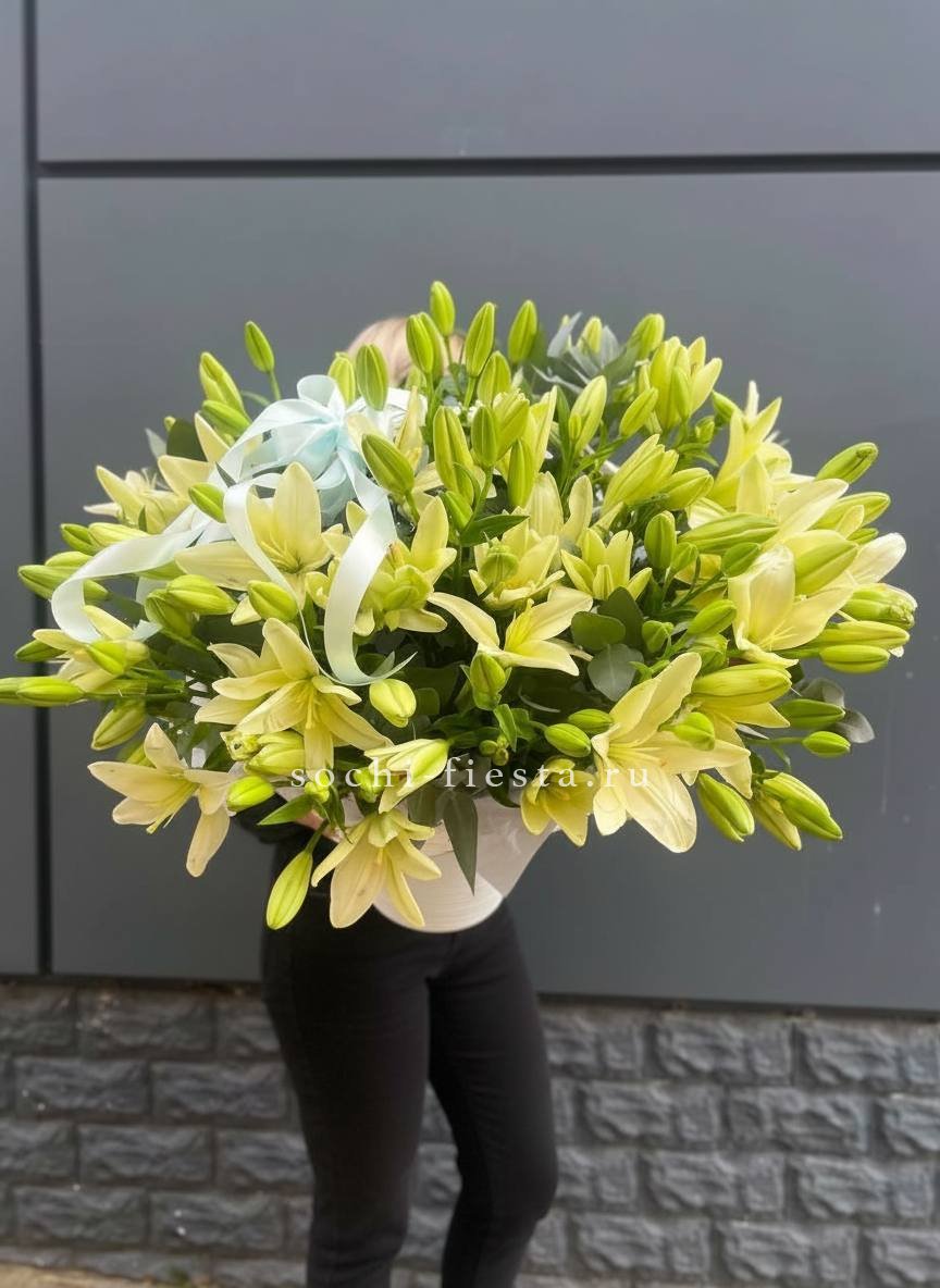 Плетеная корзина вмещает густую композицию из лилий с добавлением эвкалипта. Объемная форма создает впечатление цветущего сада, собранного в одном месте.