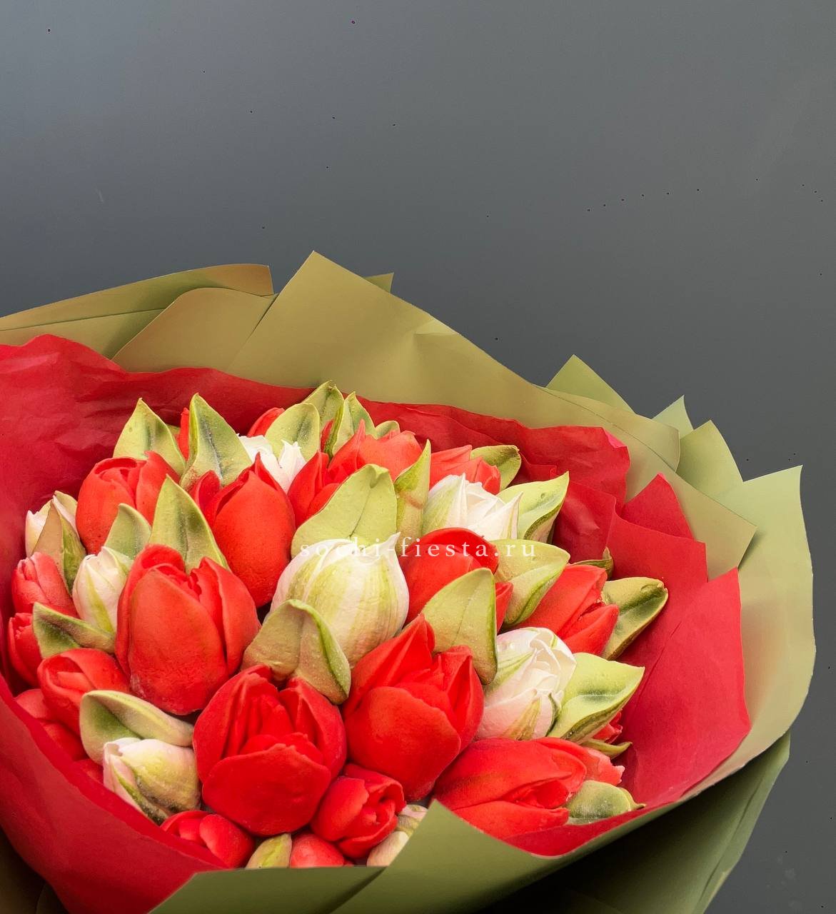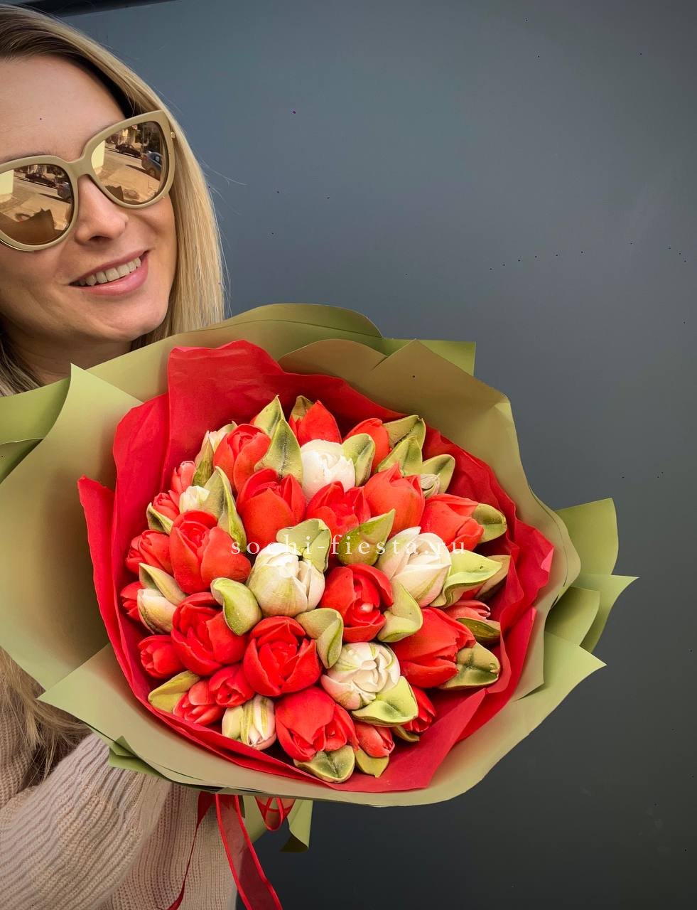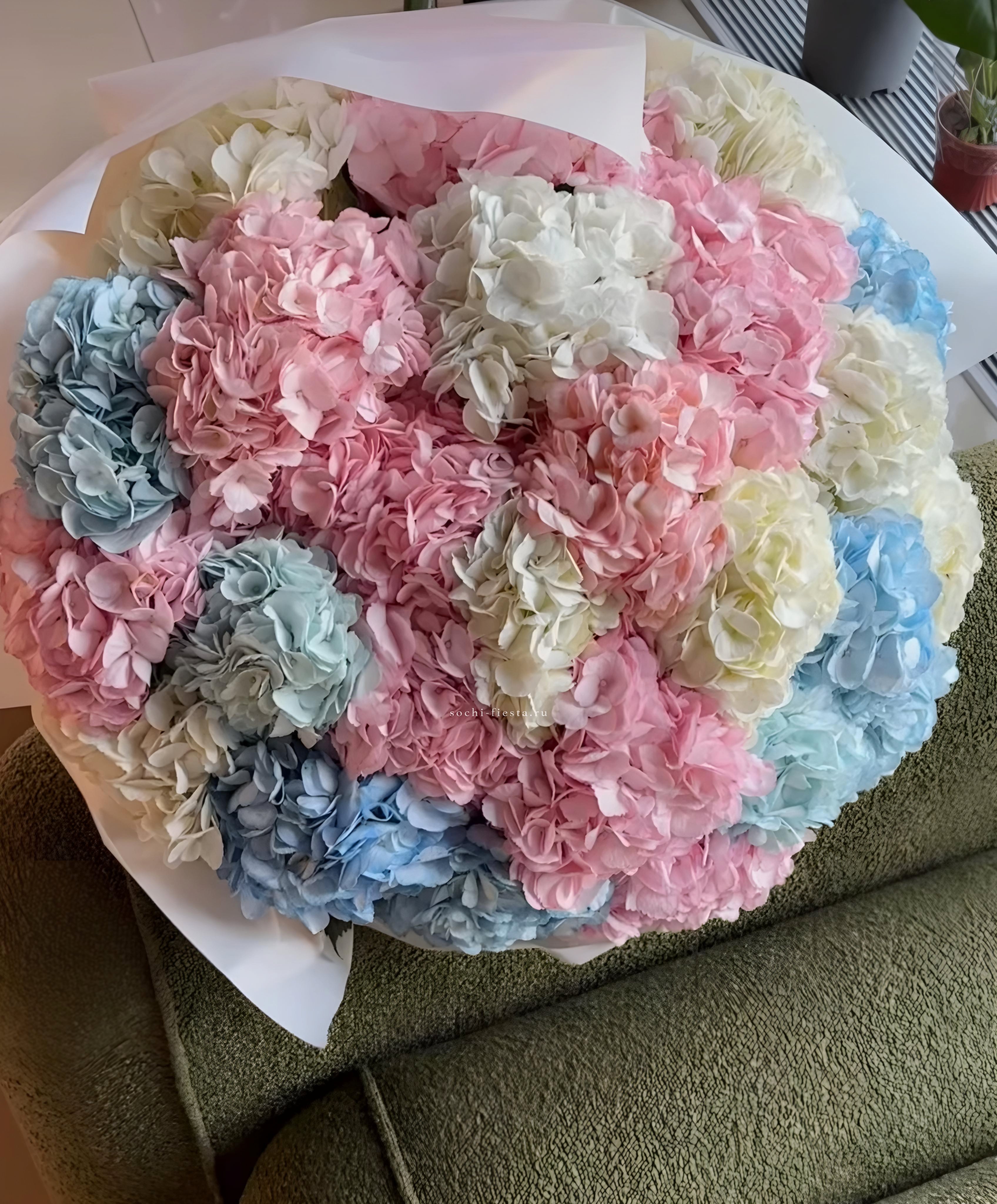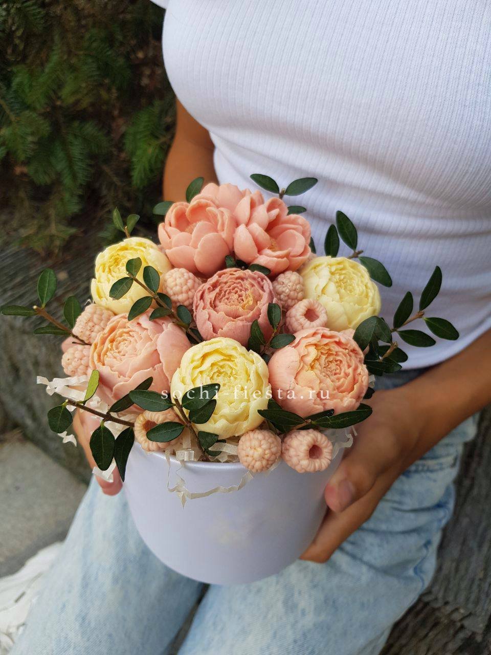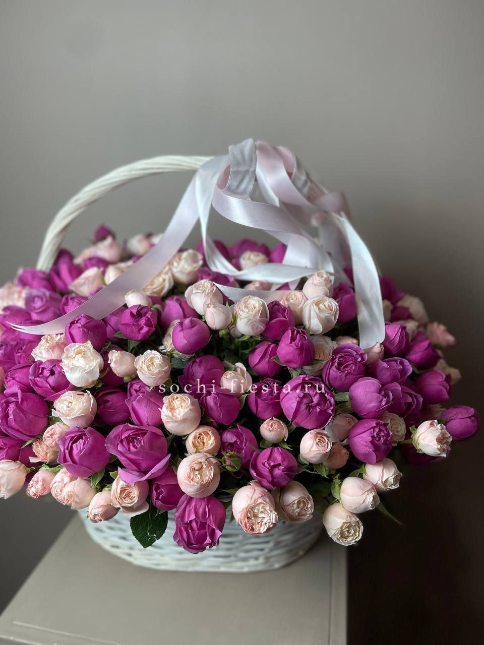 Плетеная корзина вмещает густую композицию из лилий с добавлением эвкалипта. Объемная форма создает впечатление цветущего сада, собранного в одном месте.