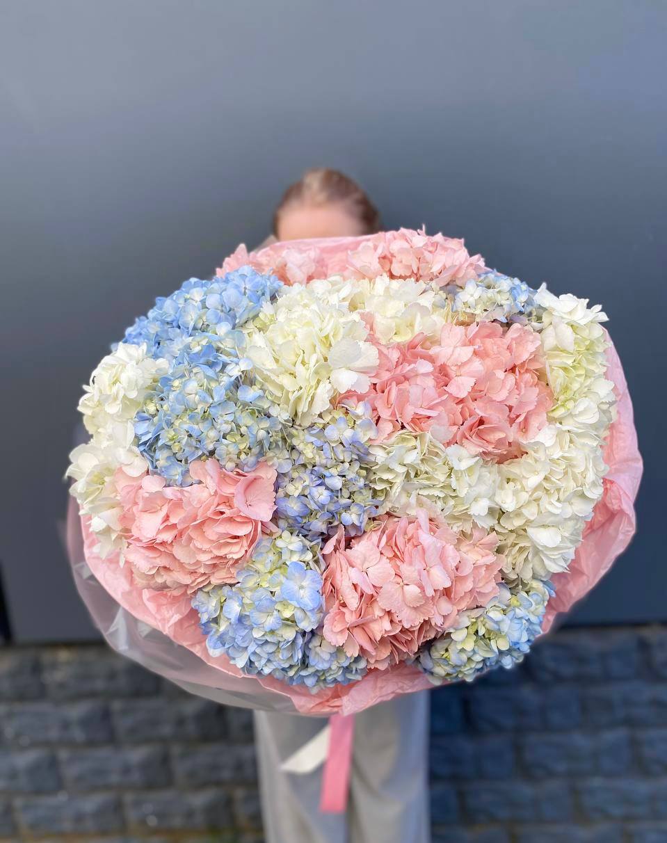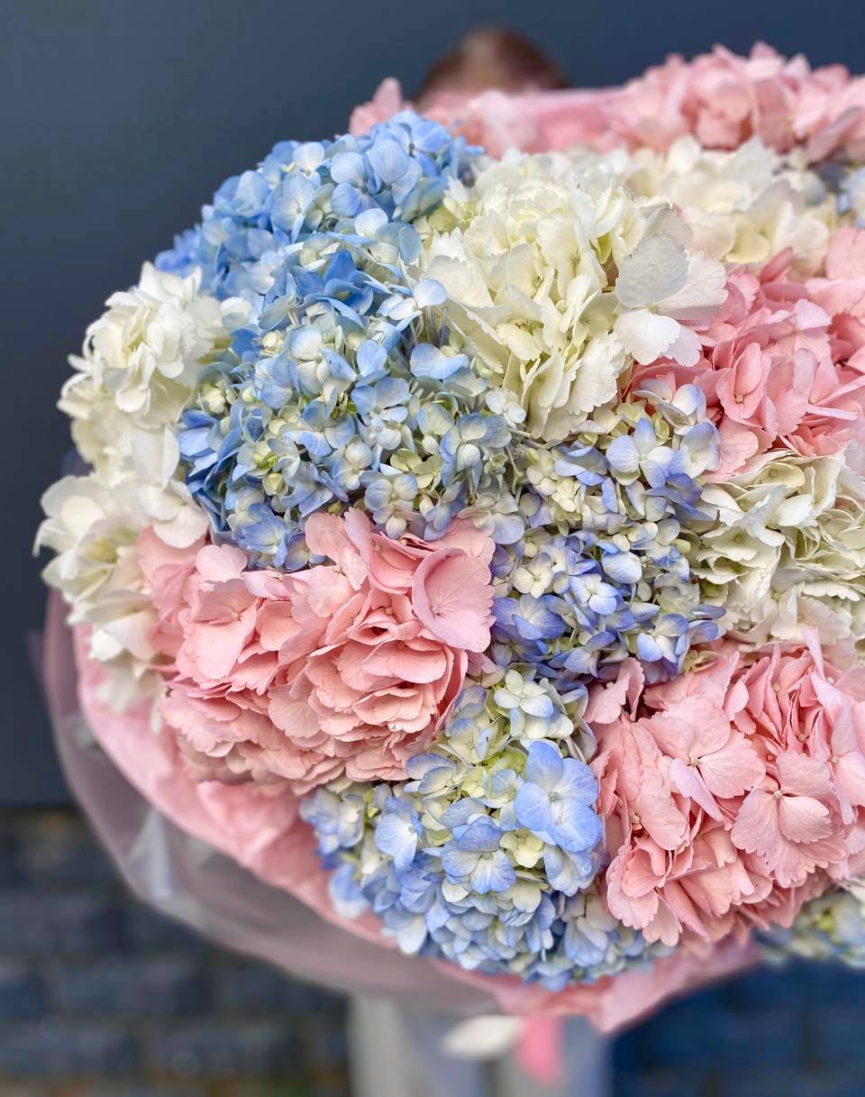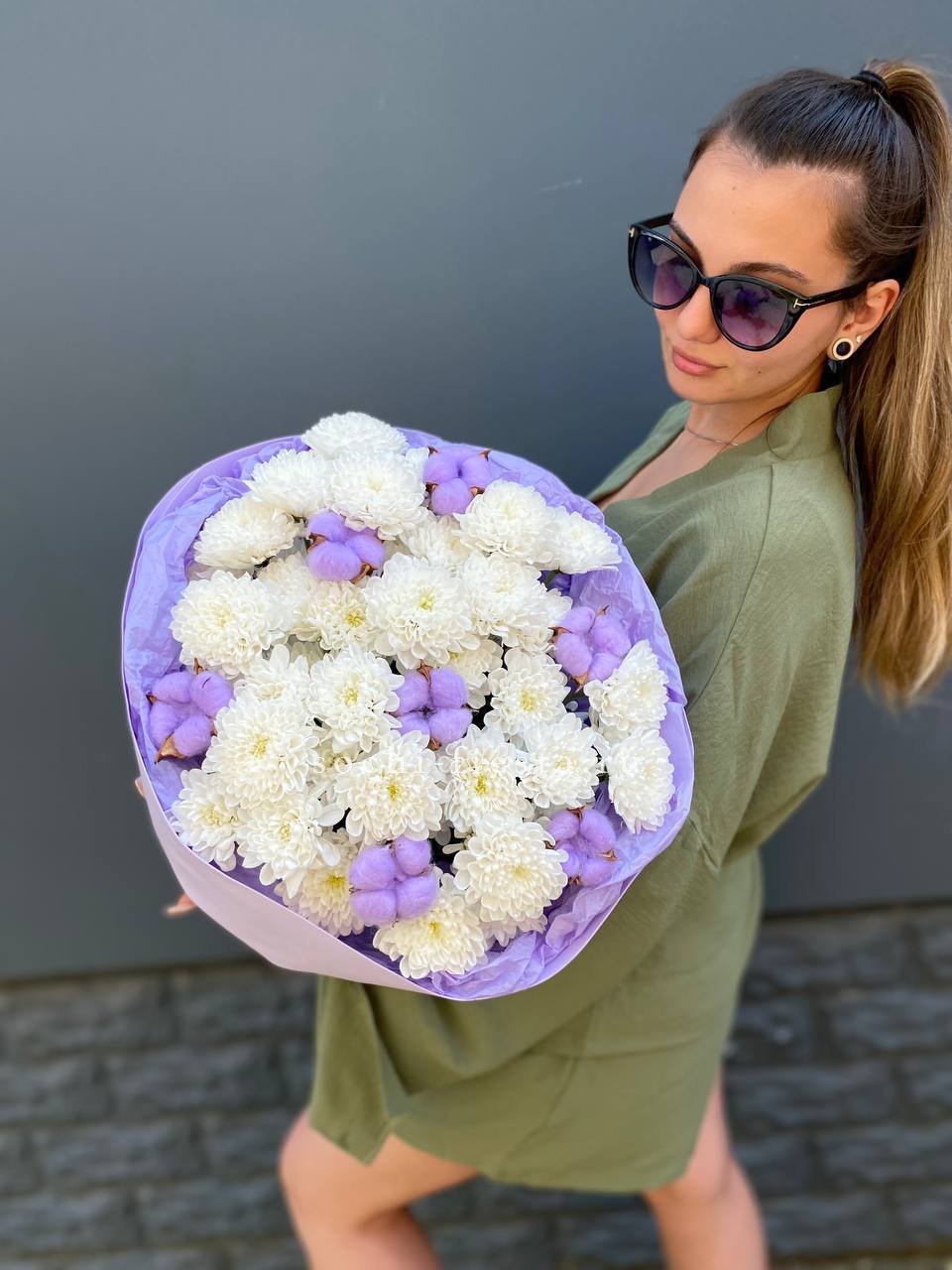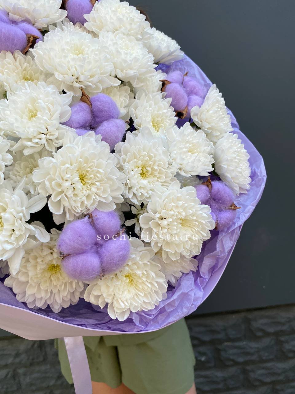 Пятьдесят один бутон Мисти Баблс собраны в плетёную корзину и образуют плотную цветущую полусферу. Лавандовые оттенки раскрываются постепенно и держат форму долго.