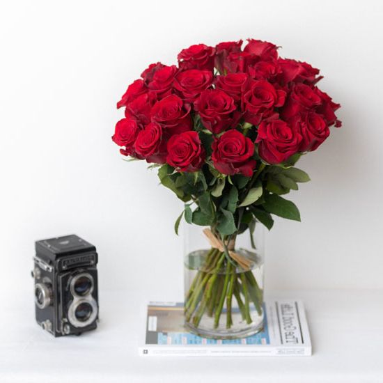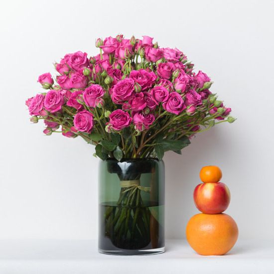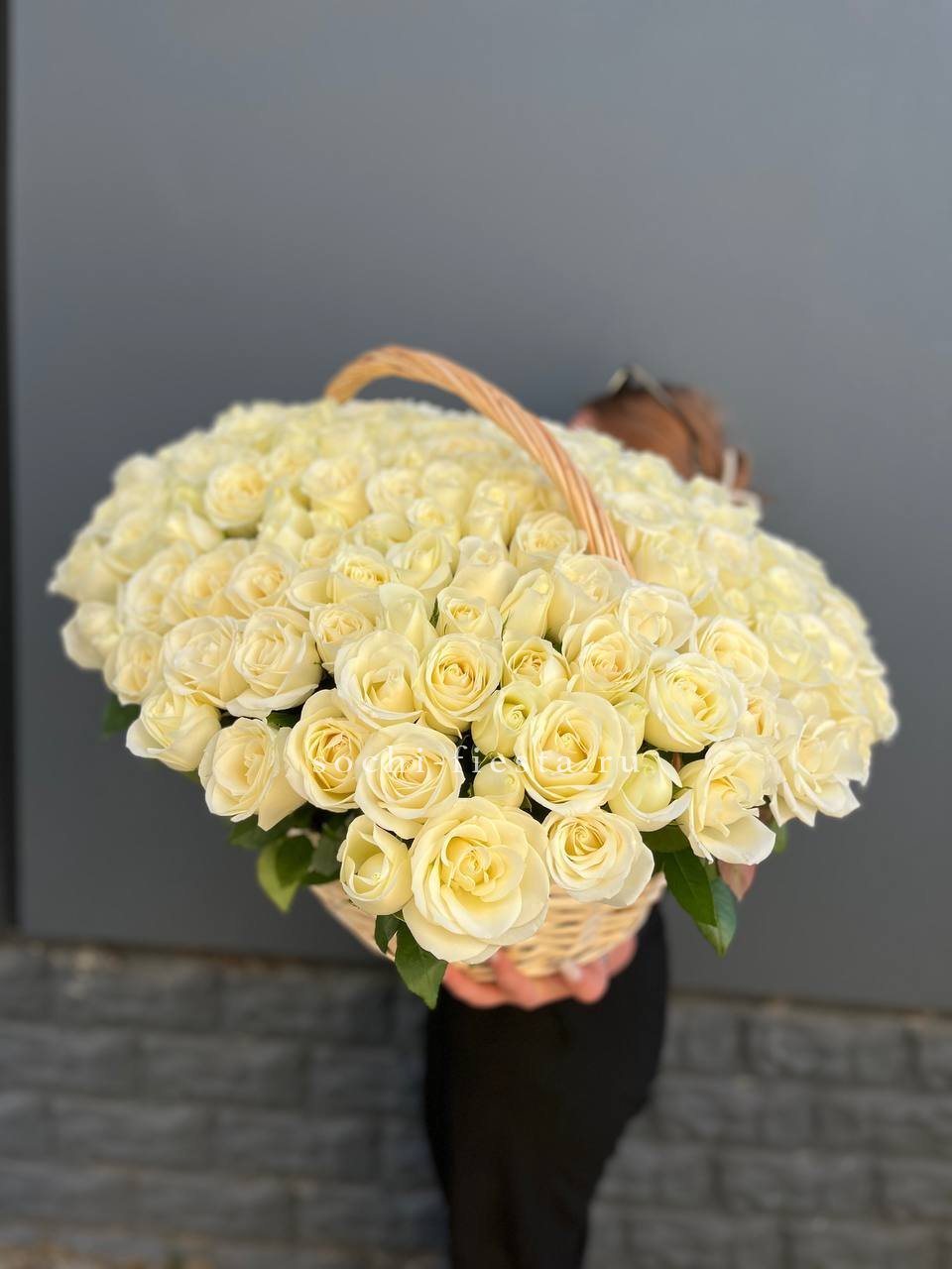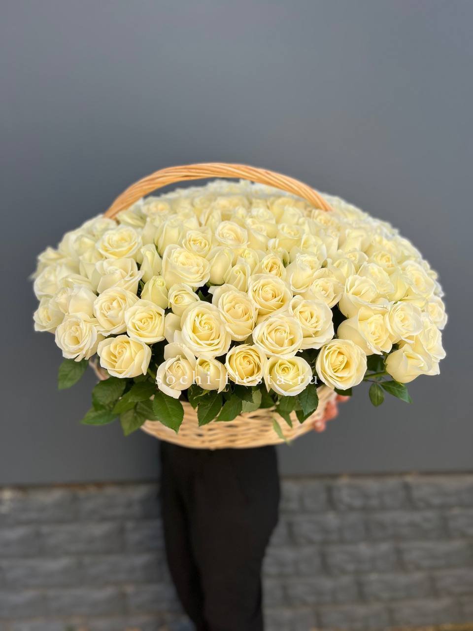 Переход от белого к розовому создаёт мягкую игру тонов. Эвкалипт добавляет фактурности и свежести зелени. Одиннадцать роз складываются в гармоничную композицию с лёгким характером.