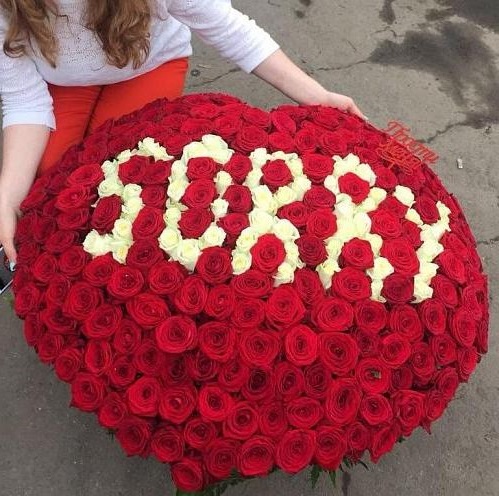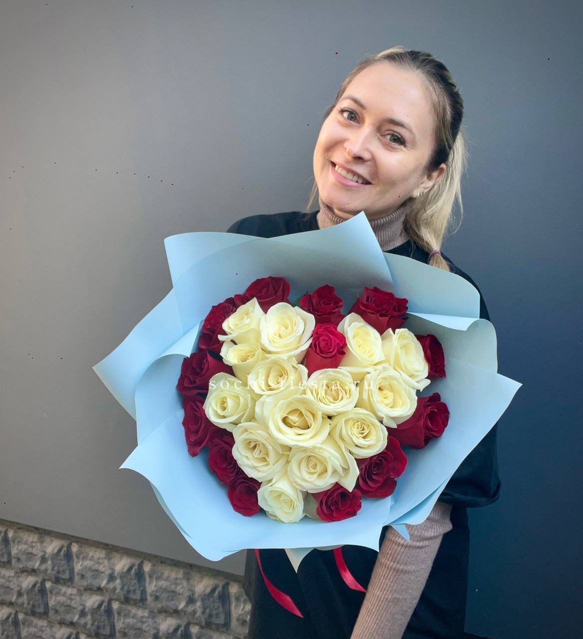 Белые и красные розы переплетаются в динамичной игре света и тени. Двадцать семь бутонов создают живописный рисунок, где каждый цвет усиливает звучание другого без лишних слов.
