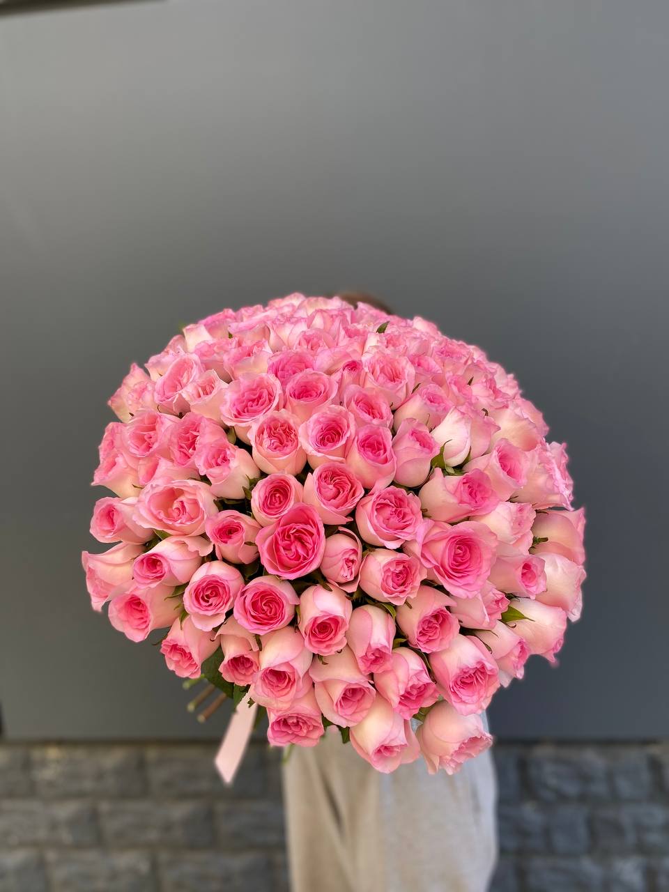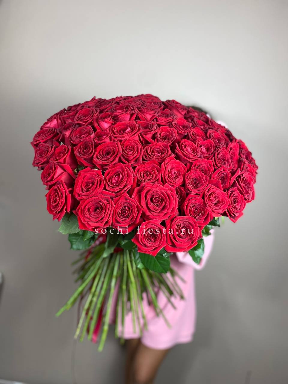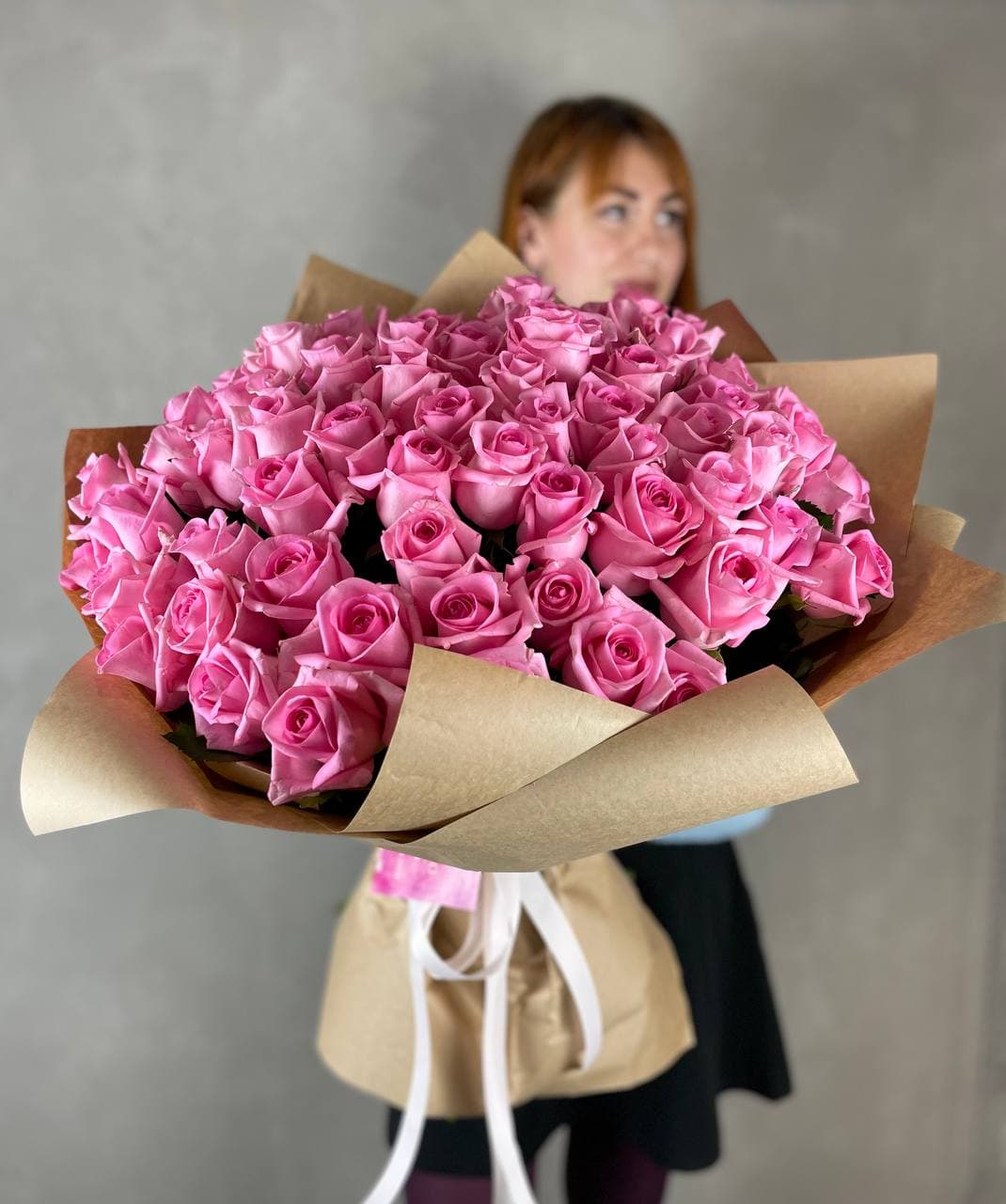 Сто одна белая роза собрана в впечатляющую охапку. Монохромная гамма и повторяющийся ритм бутонов создают мощное визуальное присутствие. Такой объём заполняет пространство и приковывает внимание.