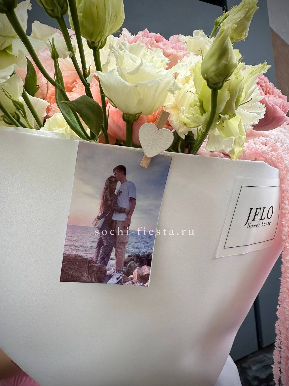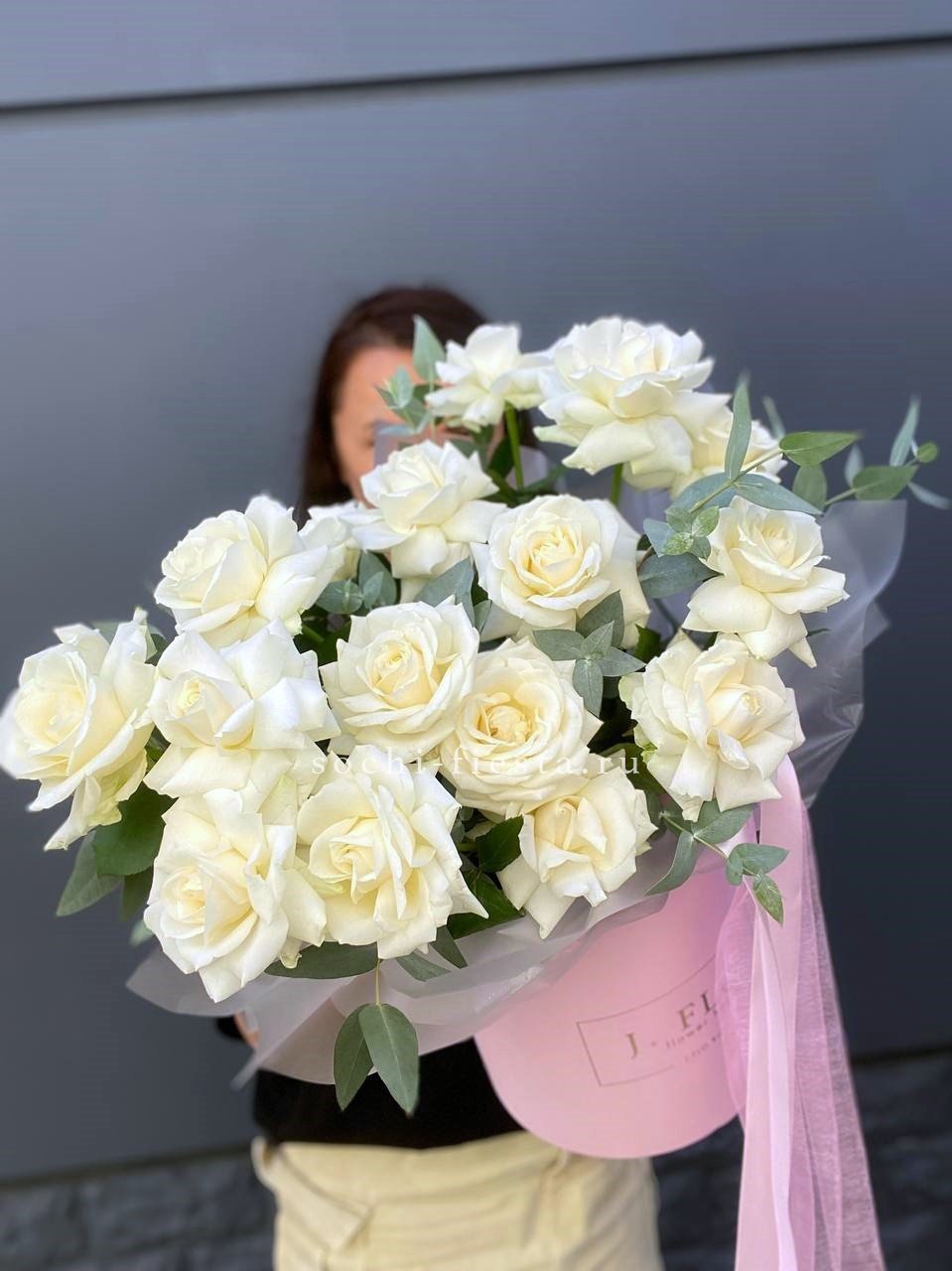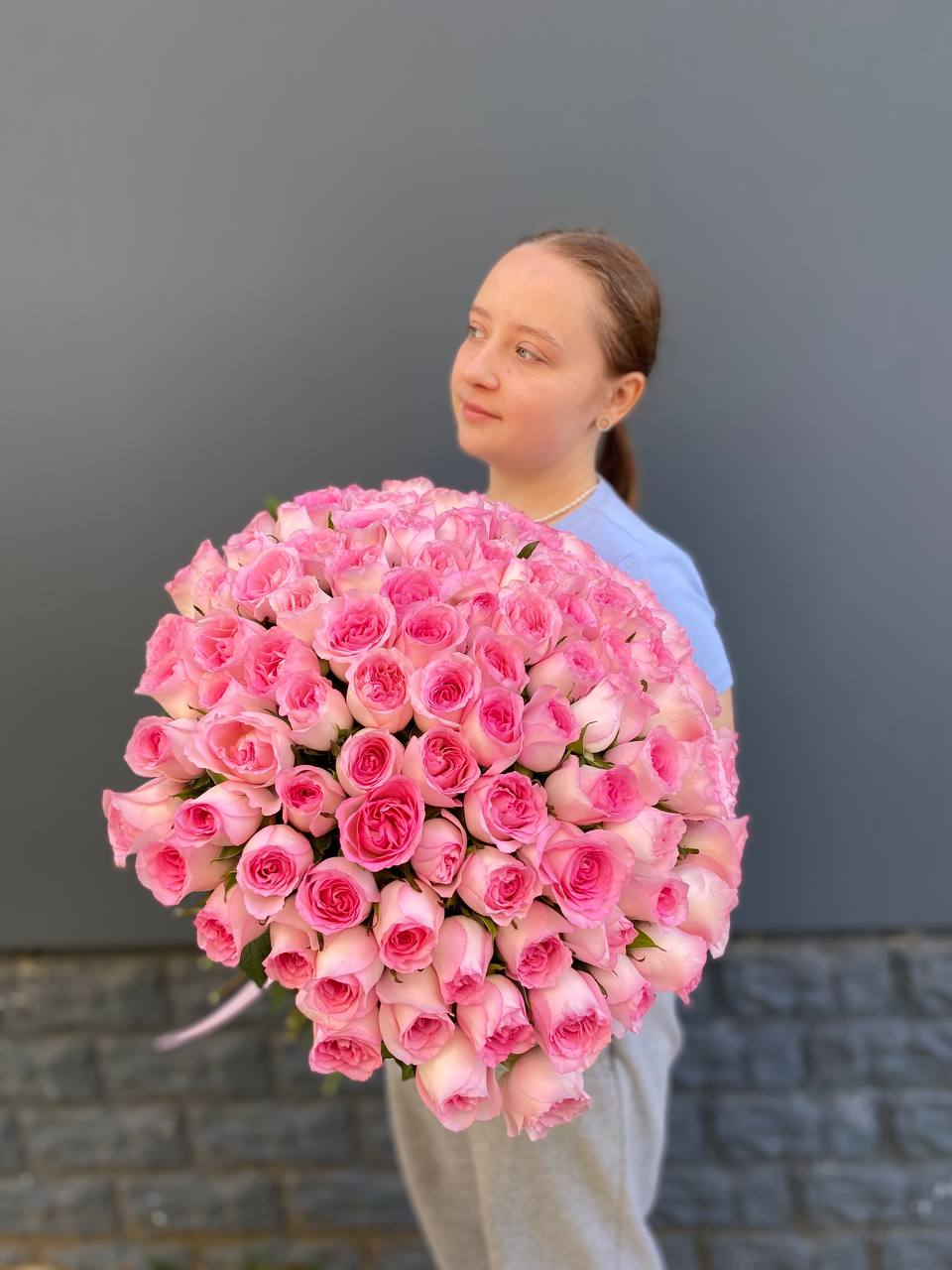 Сто одна белая роза собрана в впечатляющую охапку. Монохромная гамма и повторяющийся ритм бутонов создают мощное визуальное присутствие. Такой объём заполняет пространство и приковывает внимание.