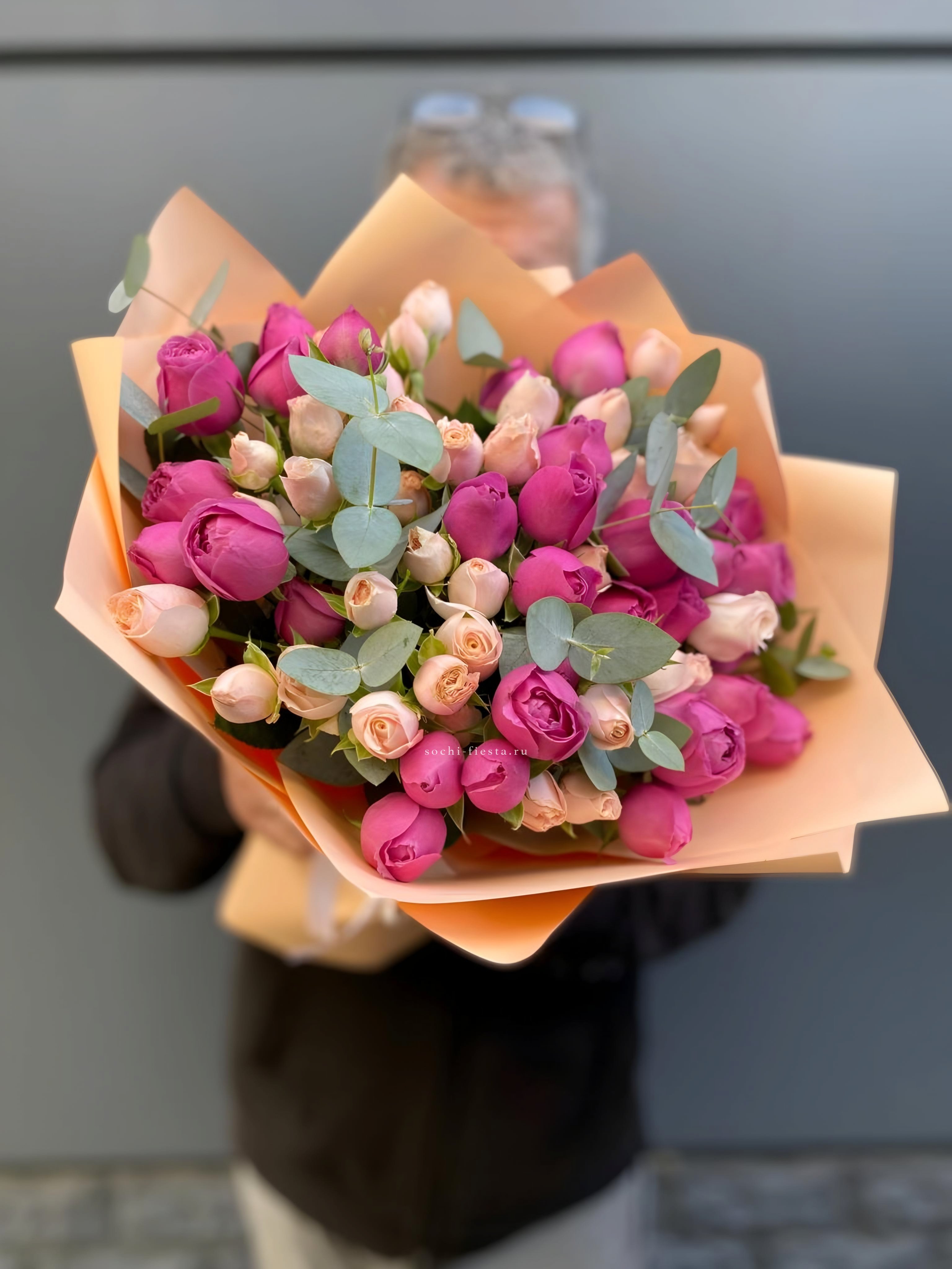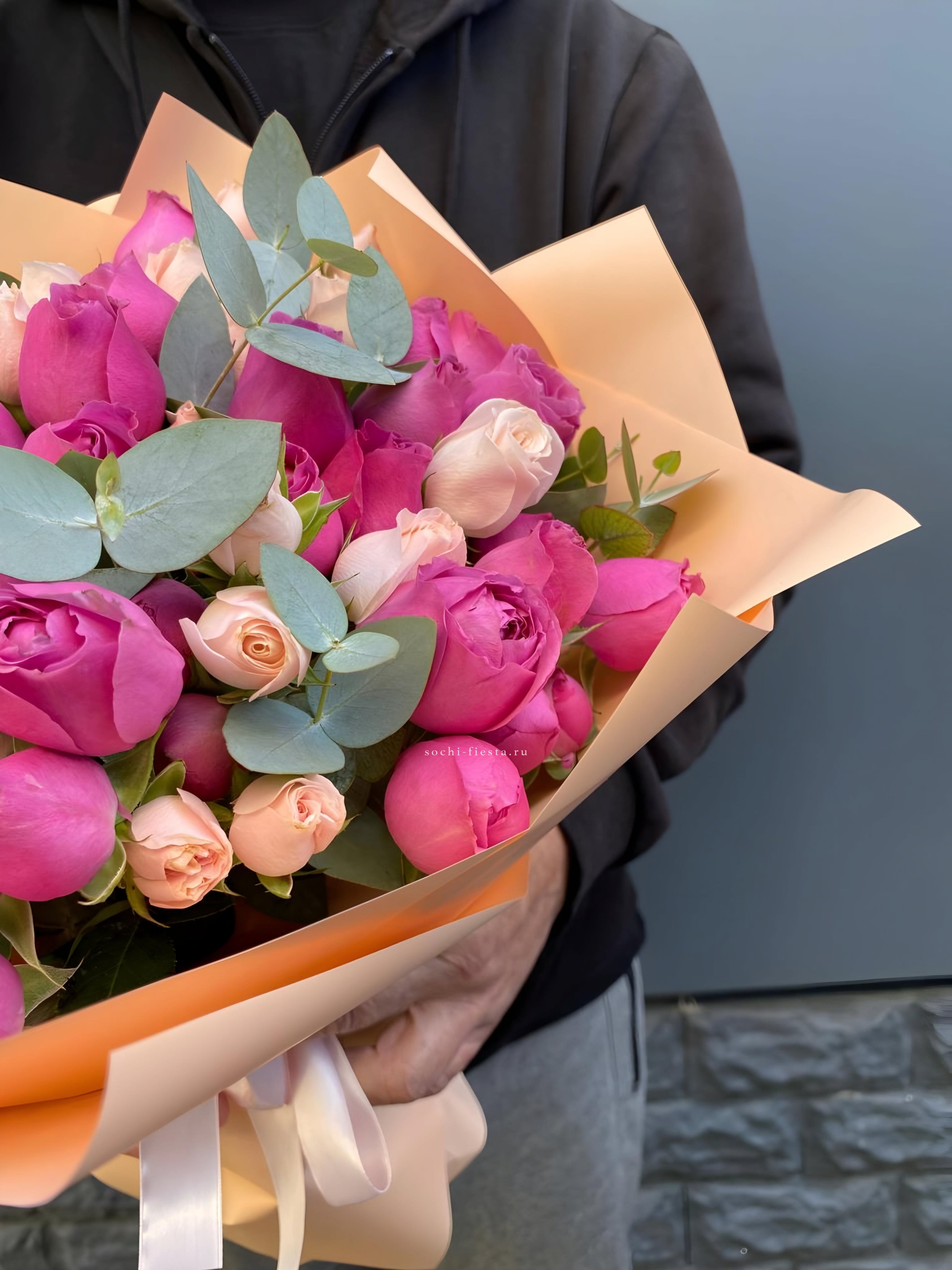 Двадцать пять вывернутых бутонов формируют объемную композицию с выразительным присутствием. Белые лепестки и зелень эвкалипта создают ощущение простора и легкости.