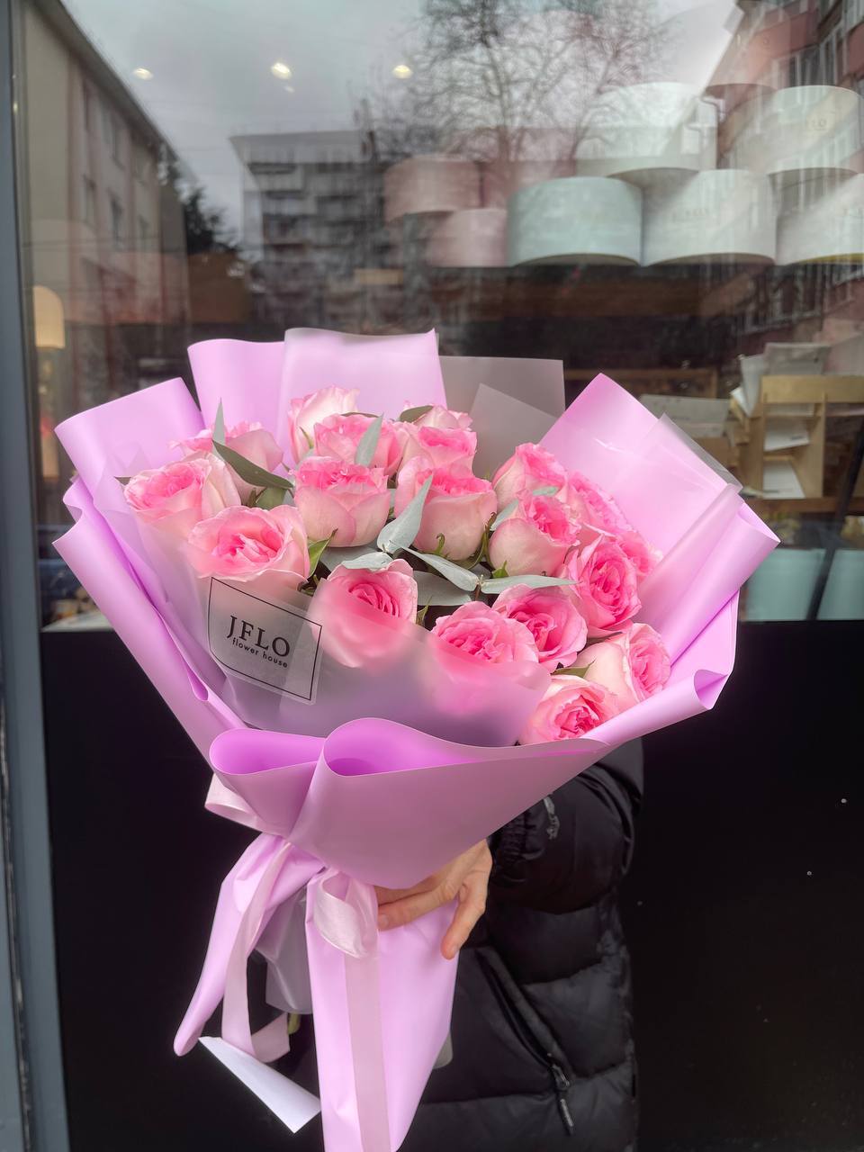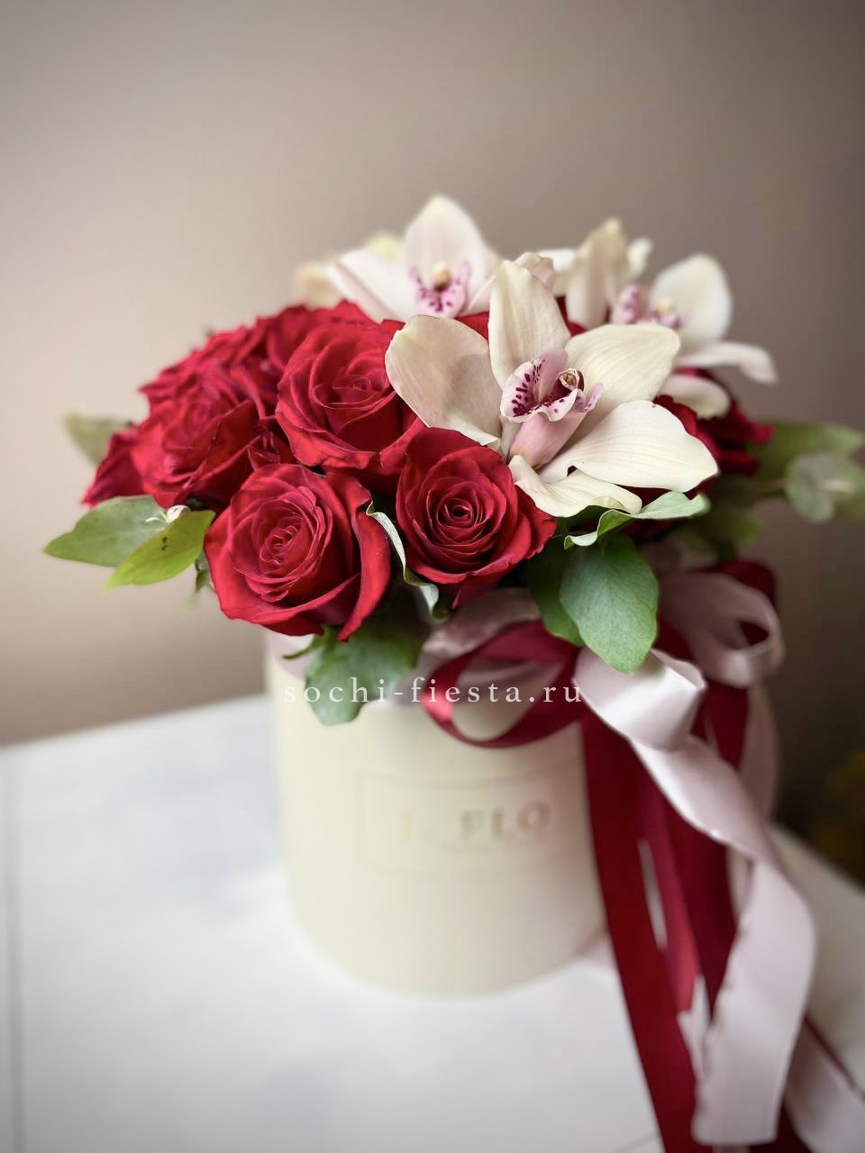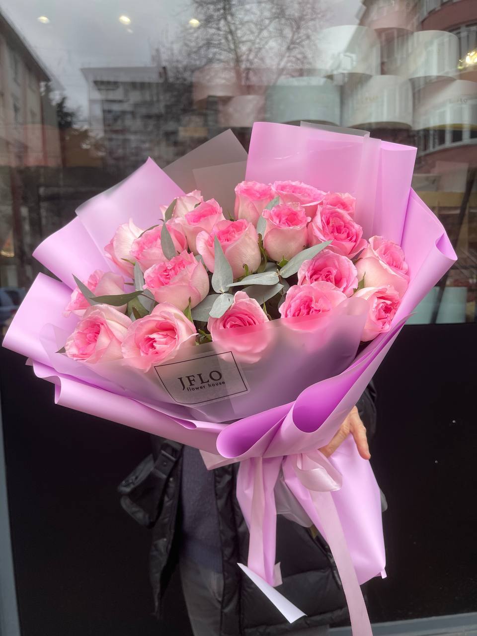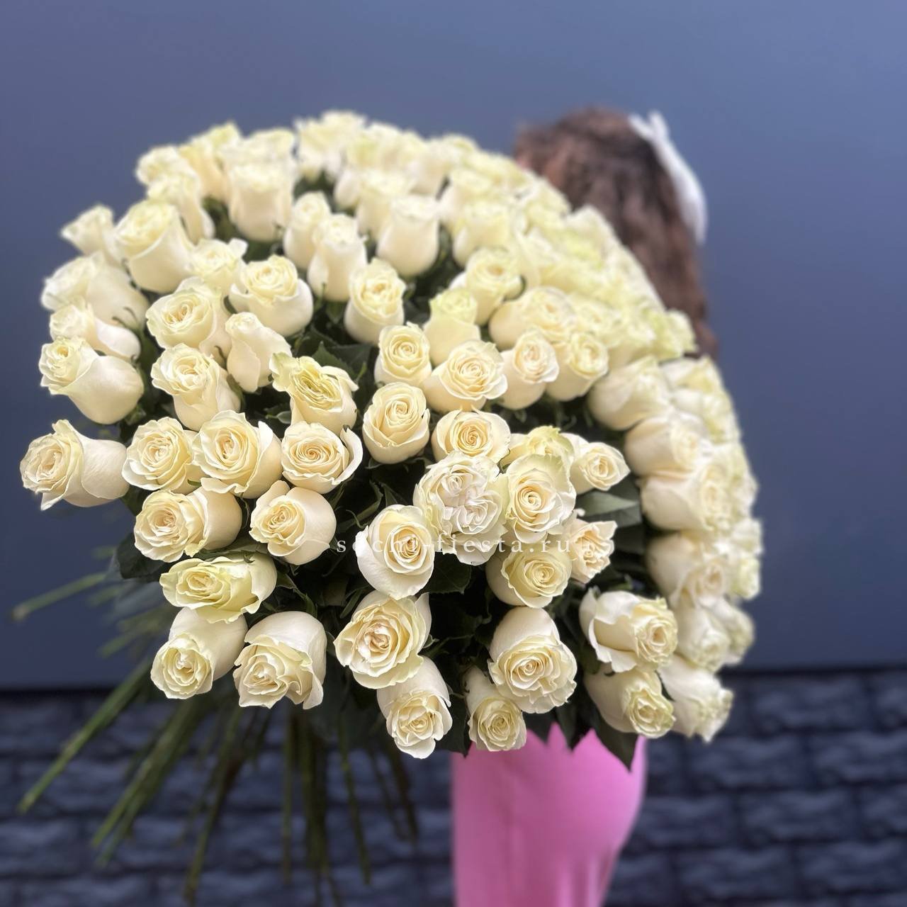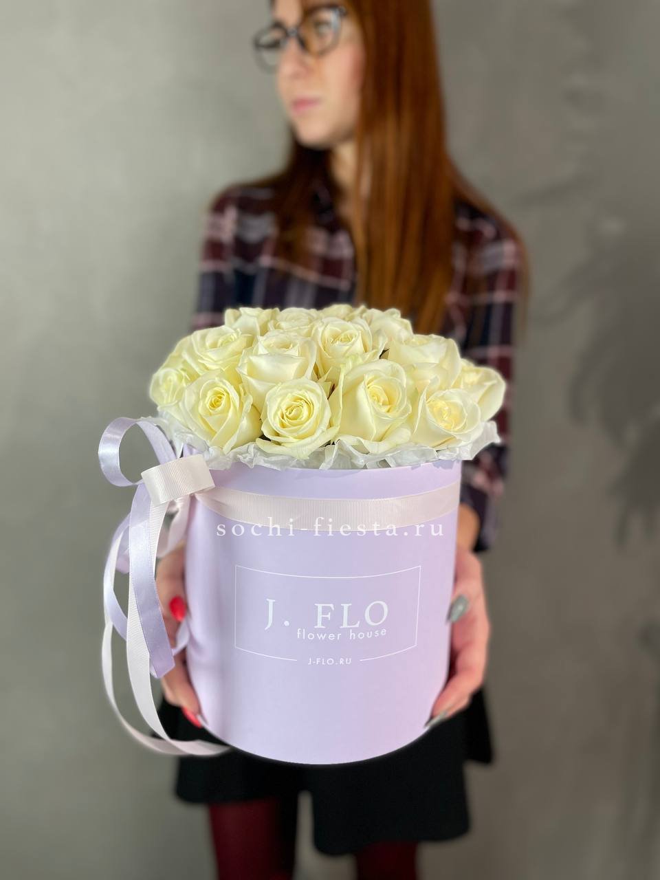 Пятнадцать белоснежных роз собраны в аккуратную форму с ровным силуэтом. Композиция сохраняет свежесть и держит структуру благодаря продуманному размещению бутонов в цилиндре.