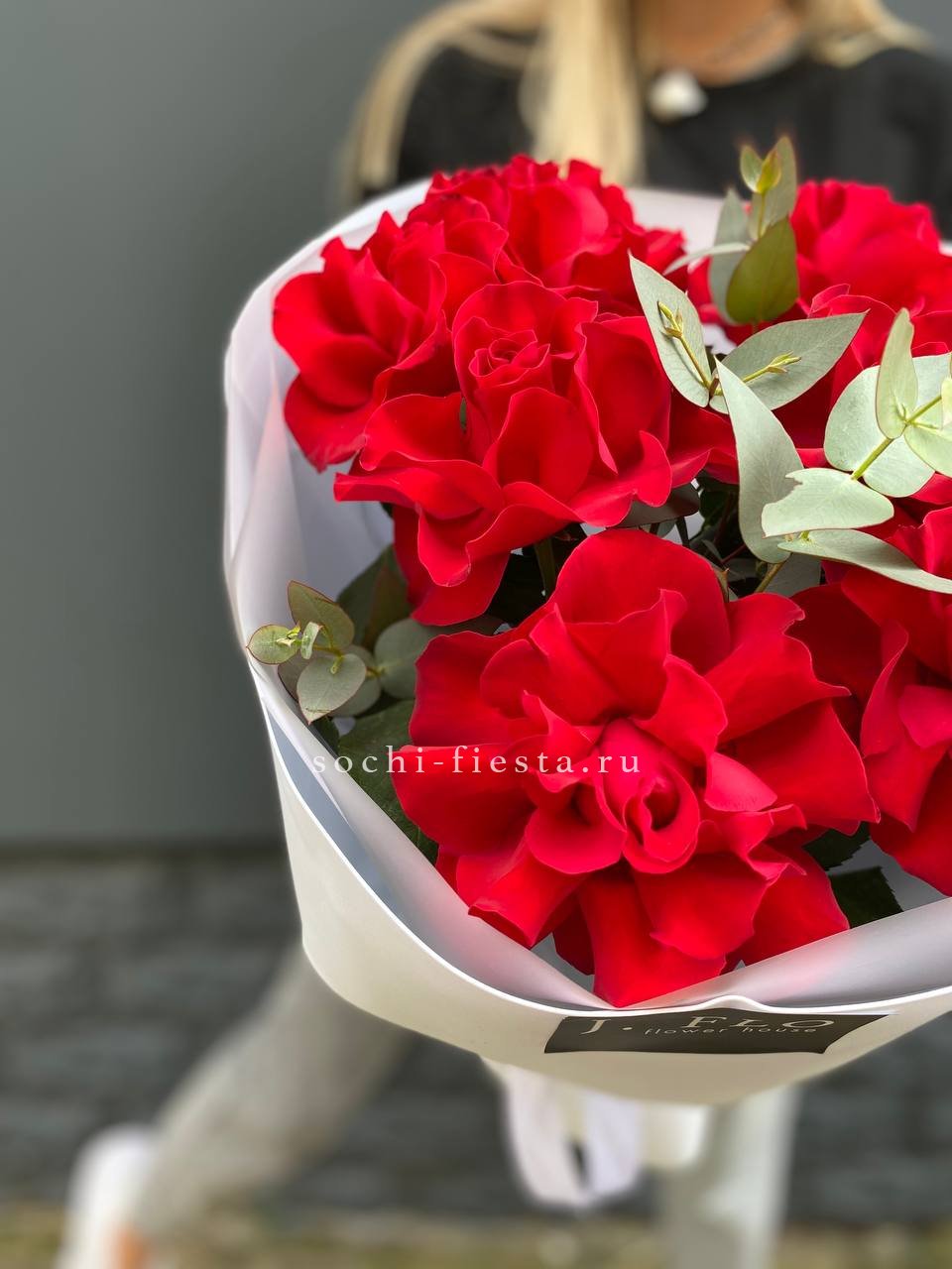 Французские розы с вывернутыми лепестками образуют пышную фактуру и глубину. Эвкалипт оттеняет насыщенность красного и придаёт букету свежесть.