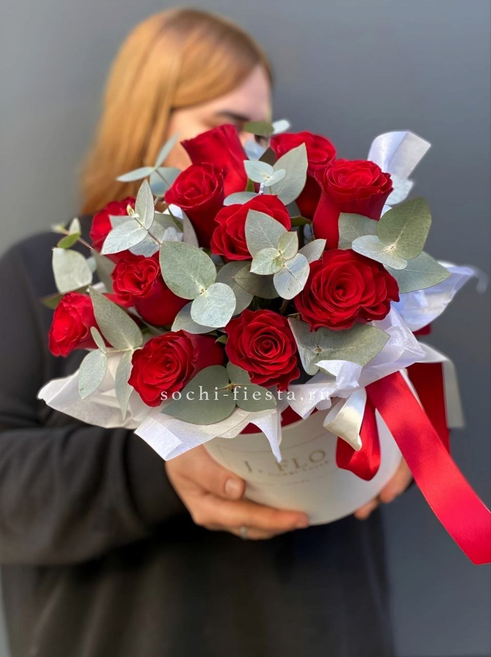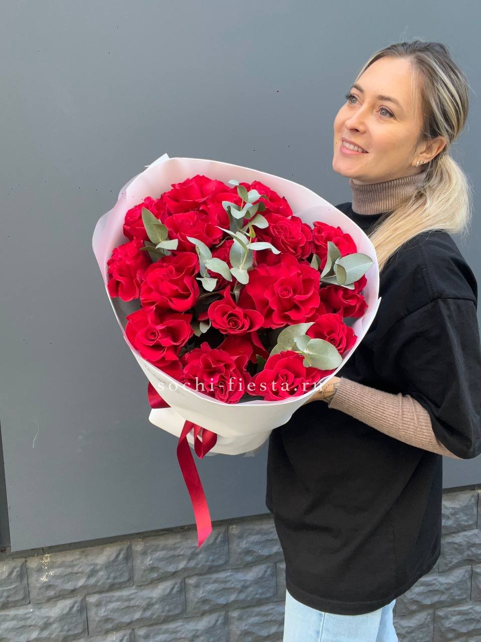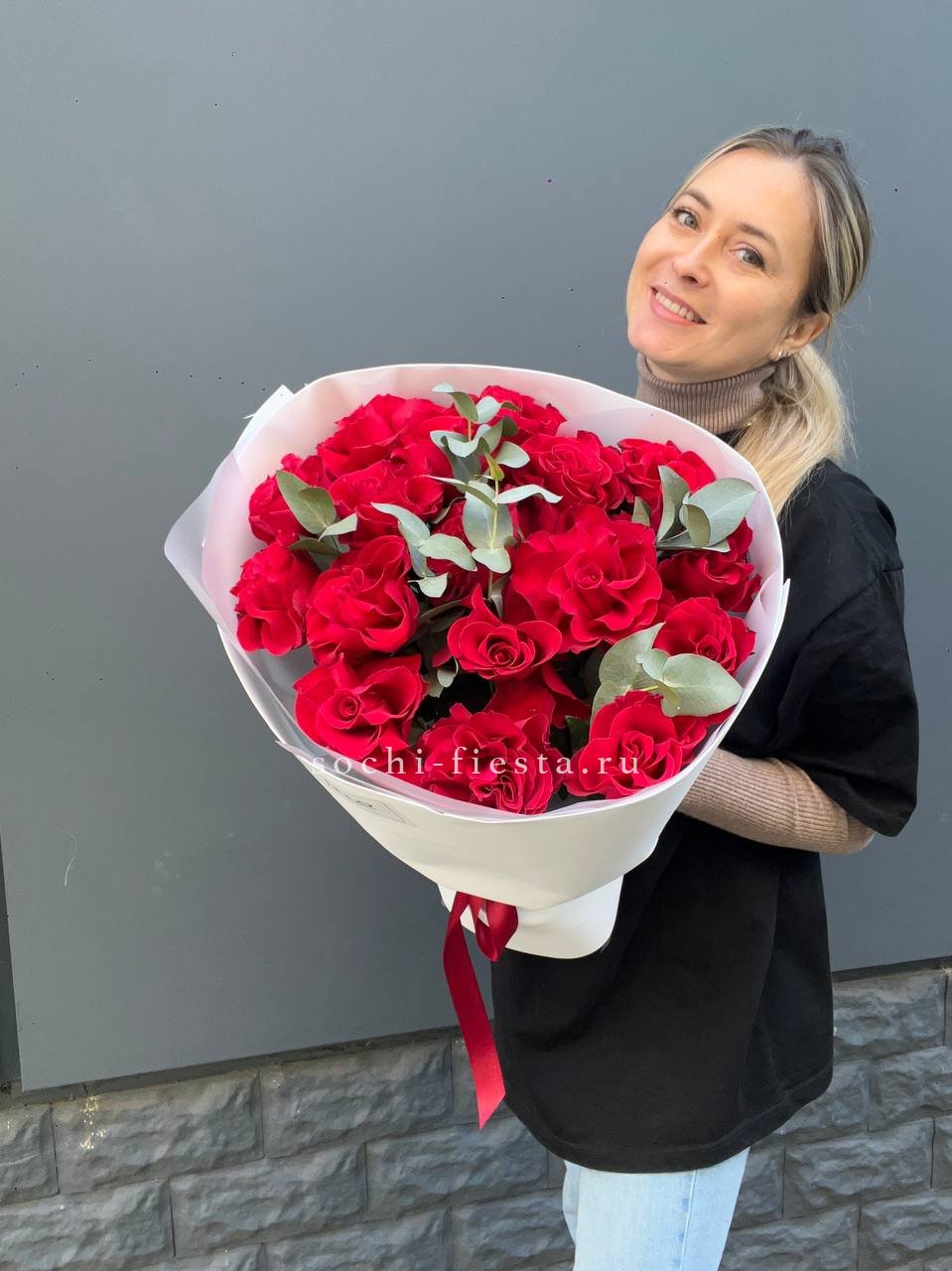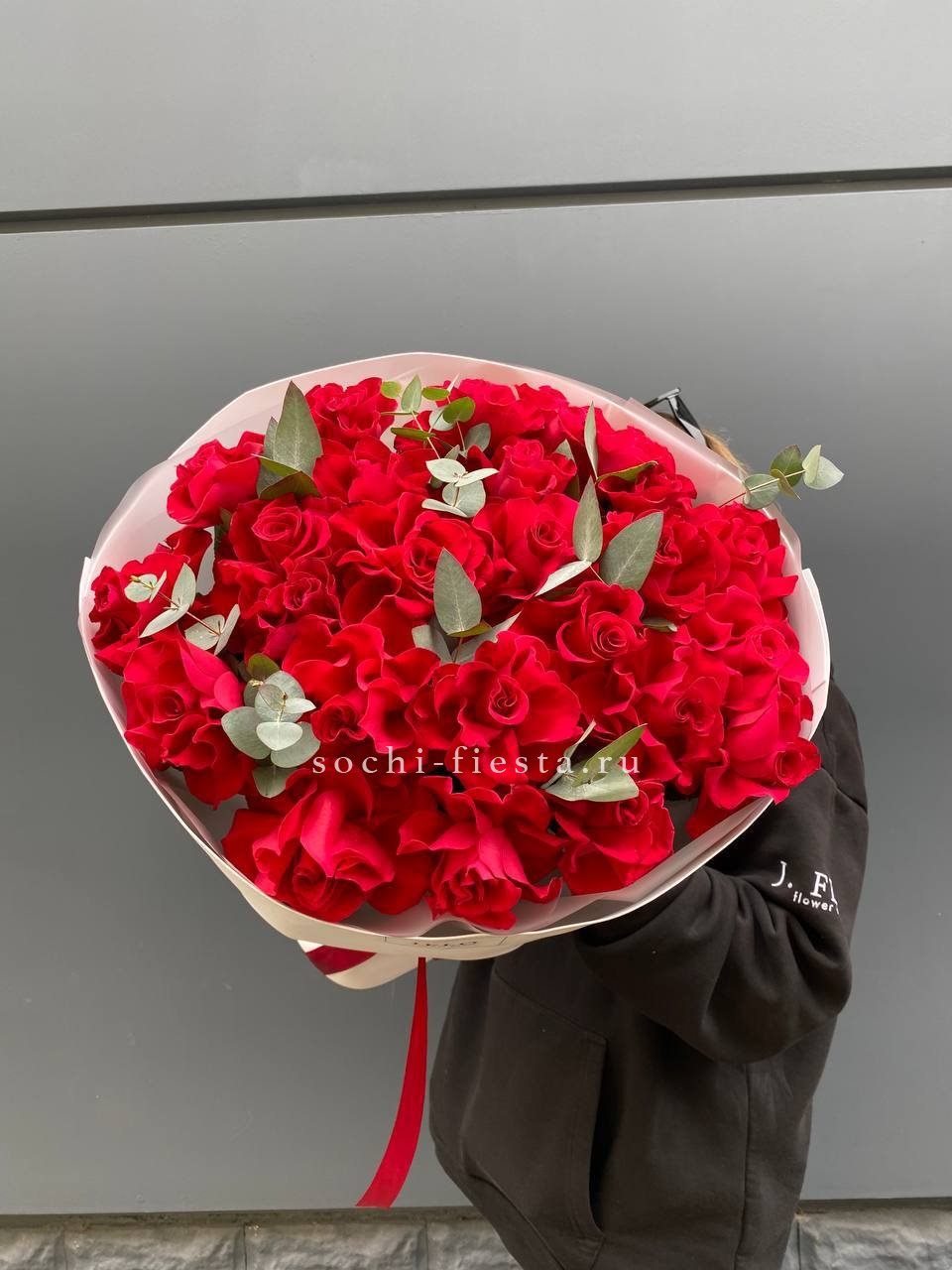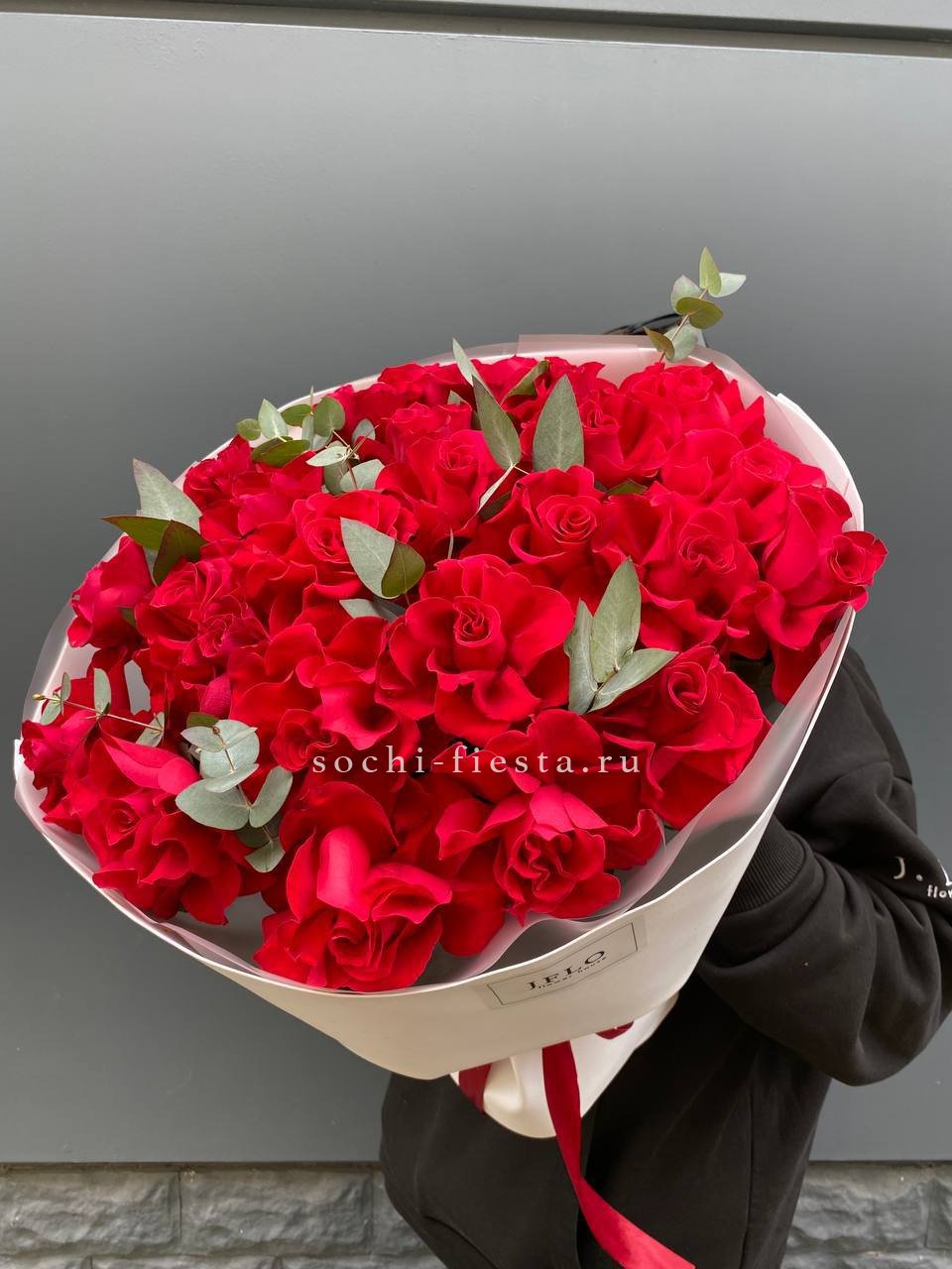 33 красных роз, лента, дизайнерская упаковка
