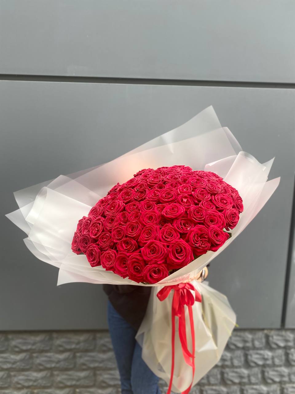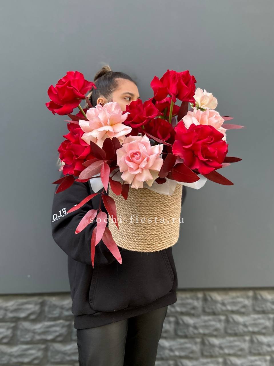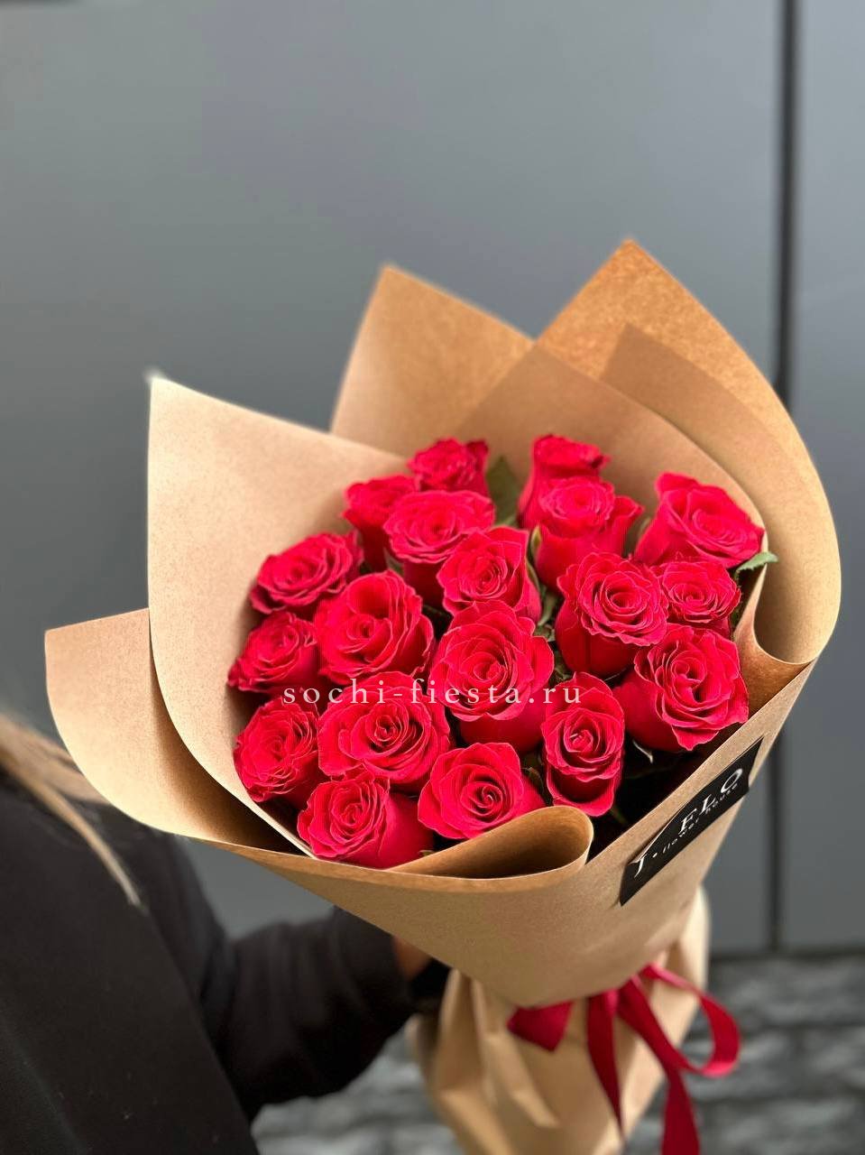 Одиннадцать французских роз с вывернутыми лепестками раскрывают всю глубину бутона. Насыщенный красный цвет и графичная форма создают яркое присутствие.