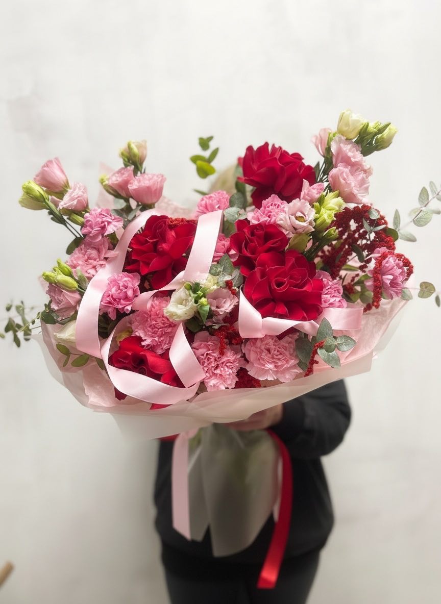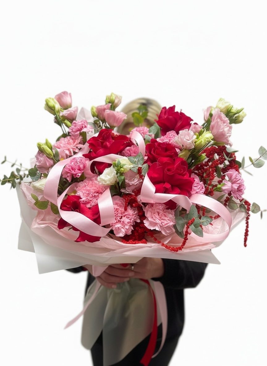 Пастельная гамма с лёгким касанием зимнего воздуха. Кустовые розы и диантус окружены воздушным ковылём, создавая мягкую текстуру с едва уловимой графикой. Гортензия добавляет объём, не перегружая силуэт.