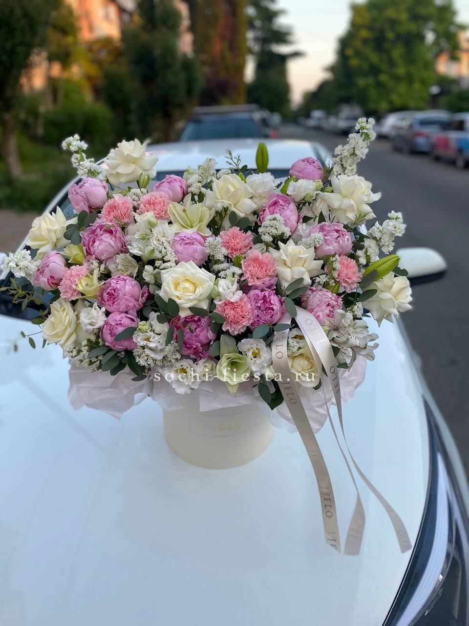гортензия, французские (вывернутые) розы, лента, дизайнерская пленка, тишью.