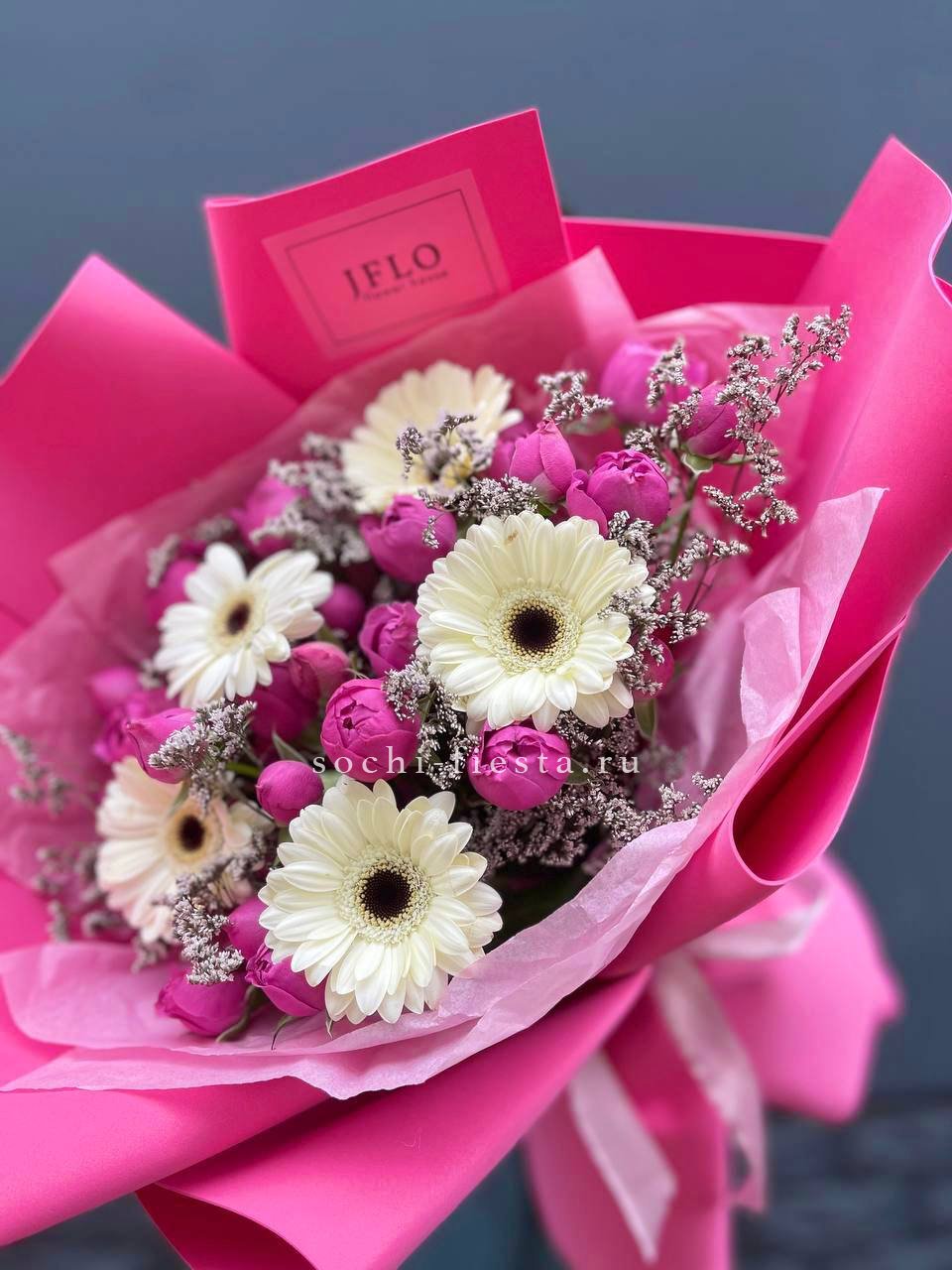 гортензия, диантус, хризантема, эустома, розы, озатамус, пленка.