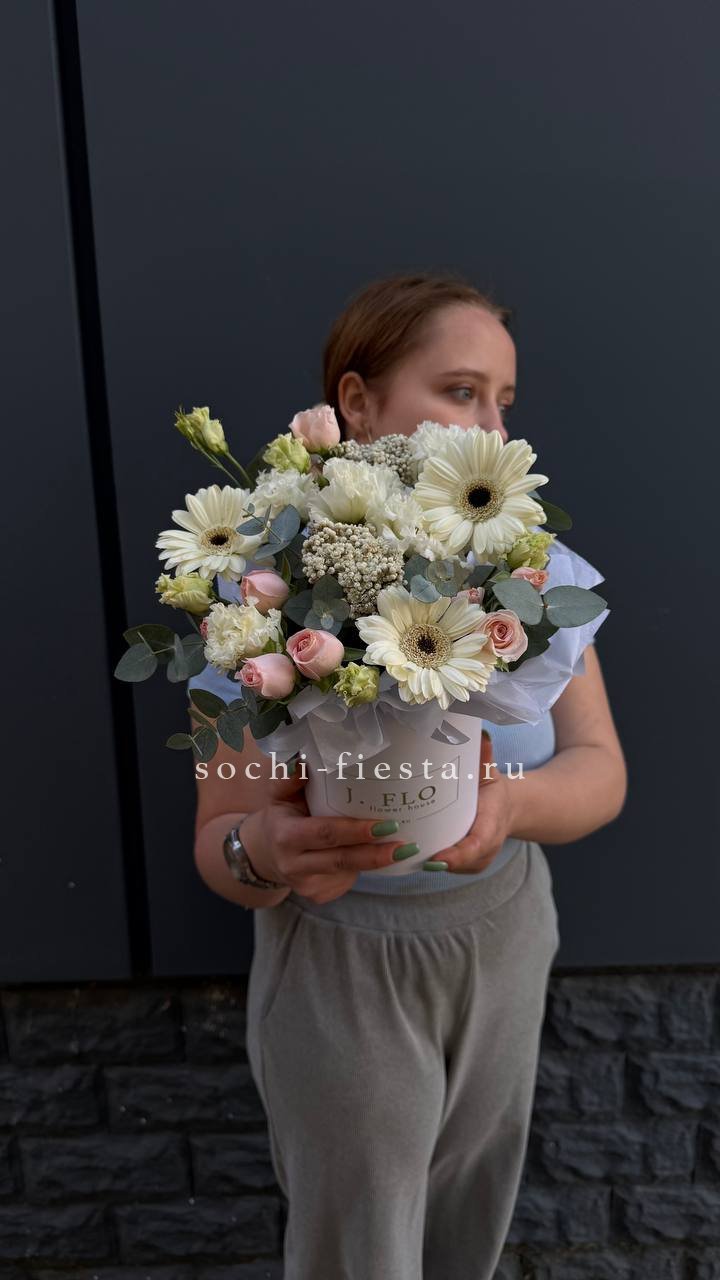 Белоснежные розы и пышные шапки гортензии сплетаются в плотную композицию, где эвкалипт задаёт спокойный ритм. Букет хорошо держит форму и долго сохраняет свежесть в вазе.