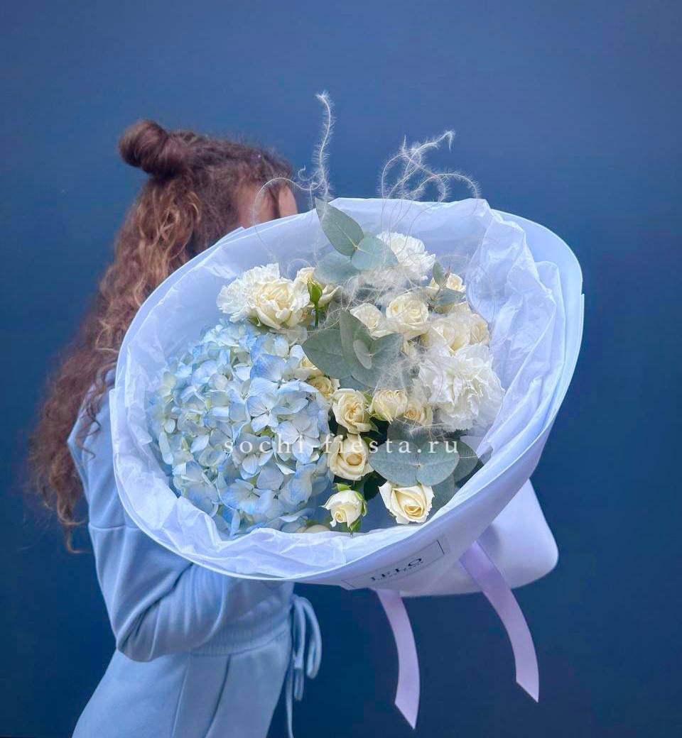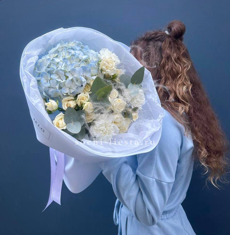 гортензия, роза, кустовая роза, диантус, эустома, дельфиниум, эвкалипт, лента, авторская упаковка.