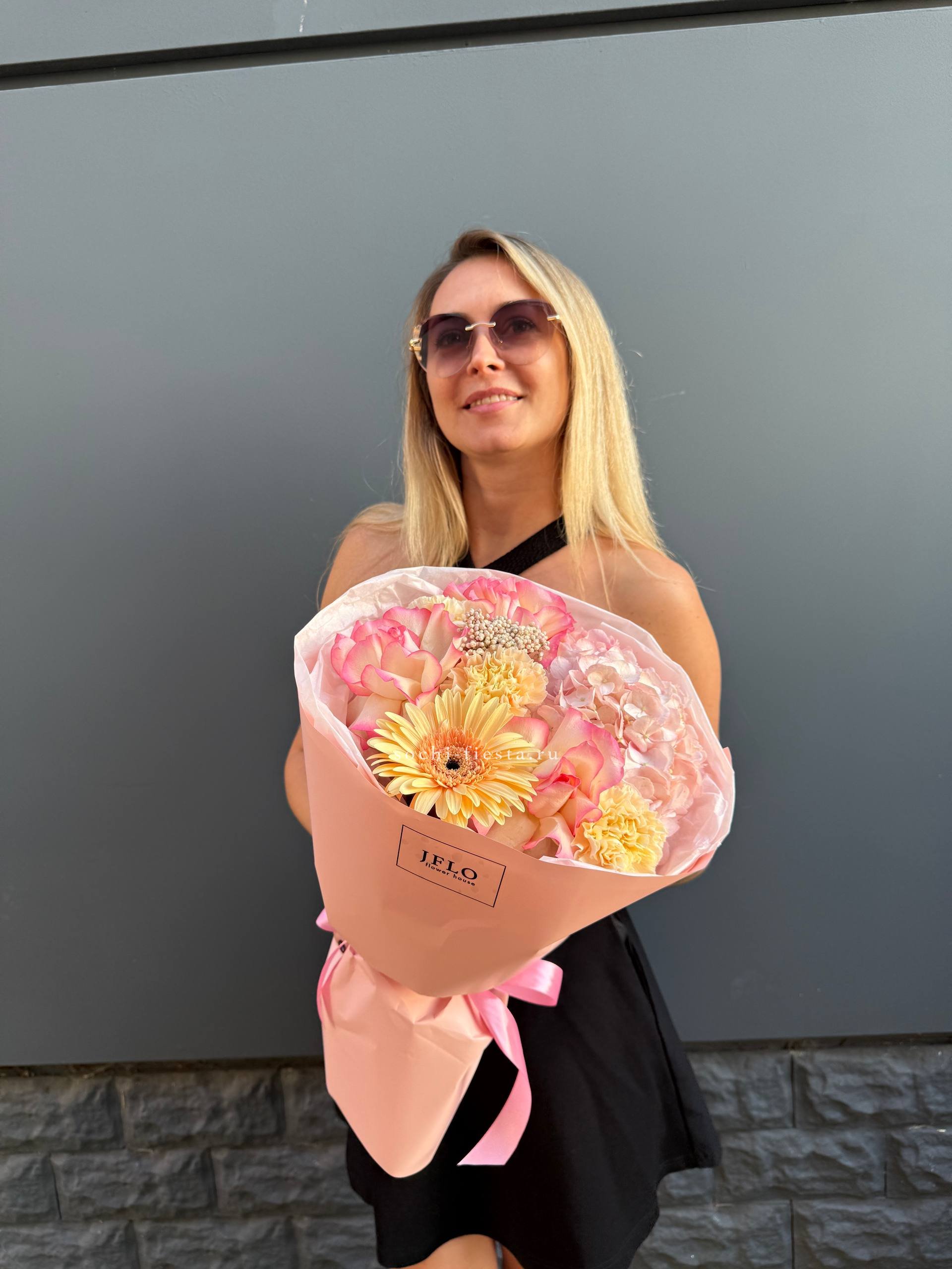 Пышная гортензия задает тон всей композиции, а розы и диантусы добавляют глубину и насыщенность. Синие штрихи дельфиниума создают живой ритм между соцветиями.