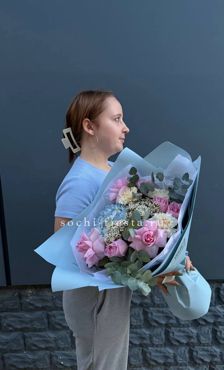 Белые розы и кустовая хризантема собраны в лаконичную форму. Светлая палитра и чистые линии букета подходят для любого повода и интерьера.